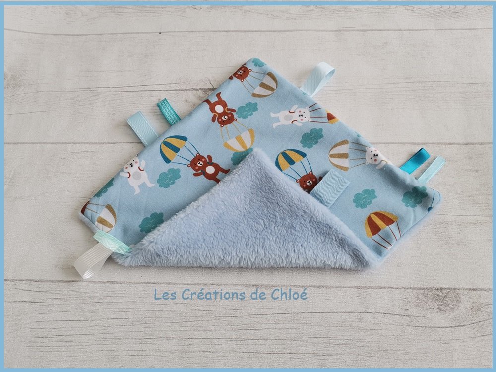 Un coté tout doux en tissu doudou de couleur bleue, l'autre face en coton certifié Oeko-Tex imprimé oursons et avec diverses