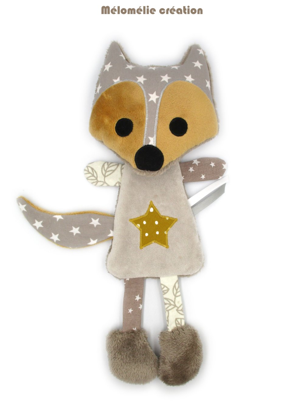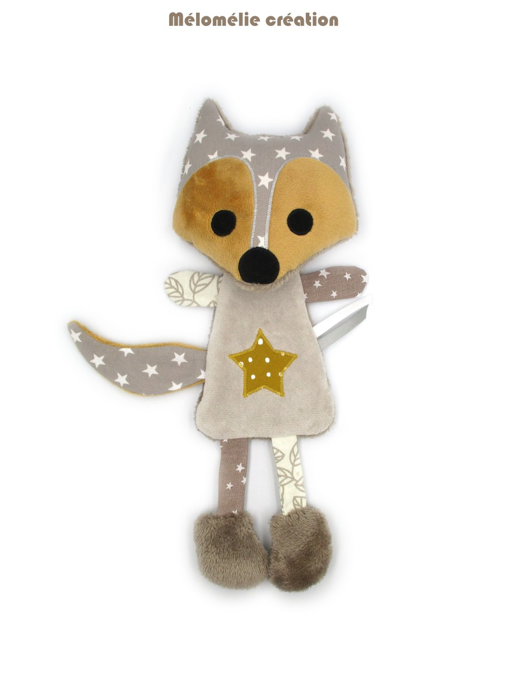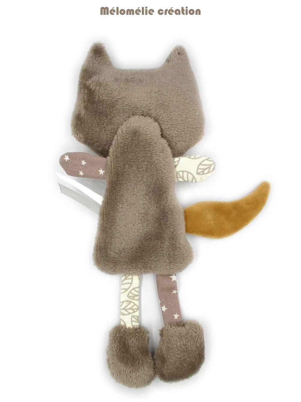 Doudou renard en minky et coton marron, 27 cm, cadeau de naissance idéal, unique et original