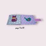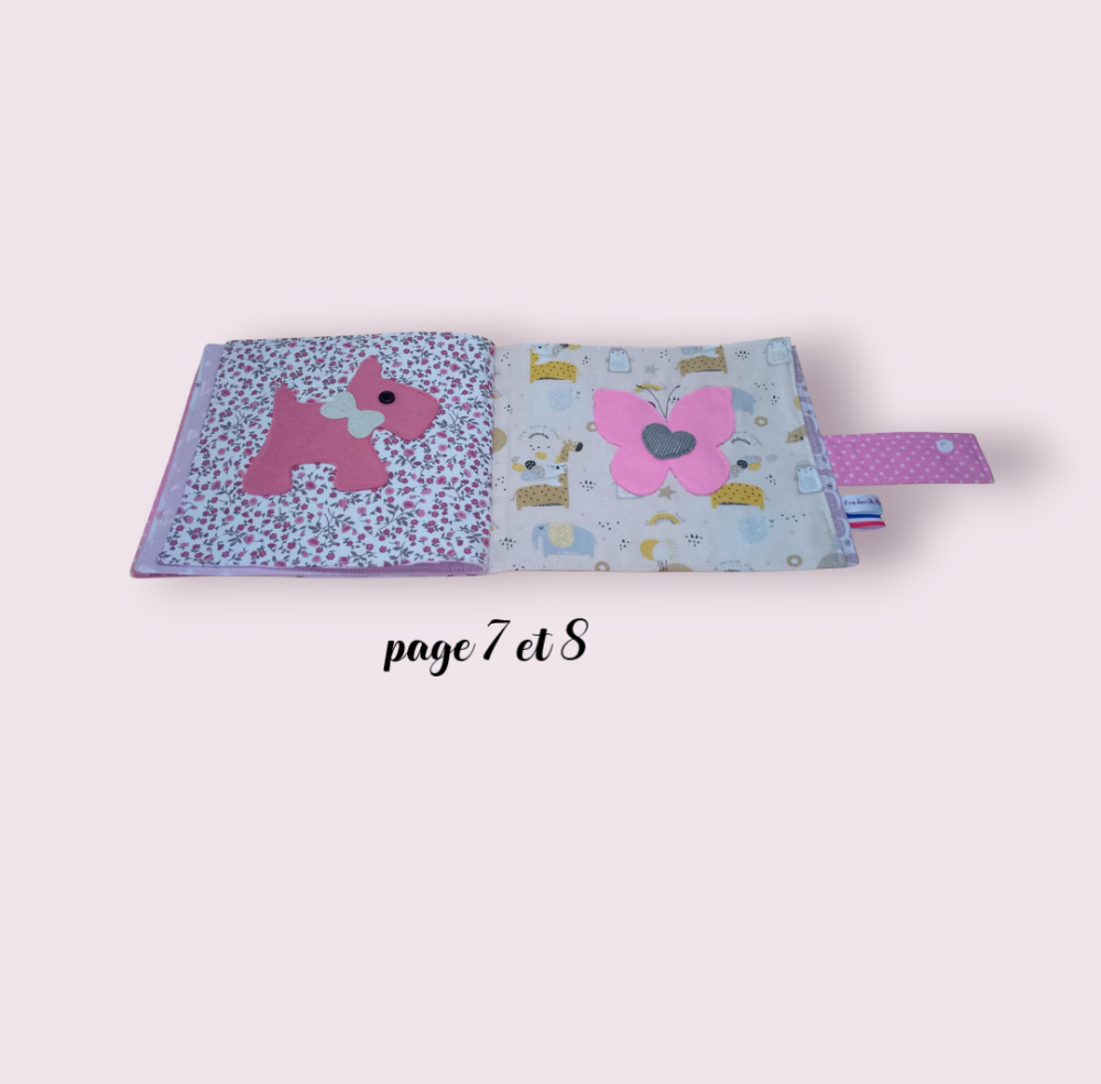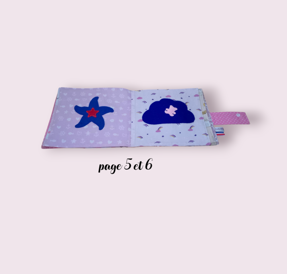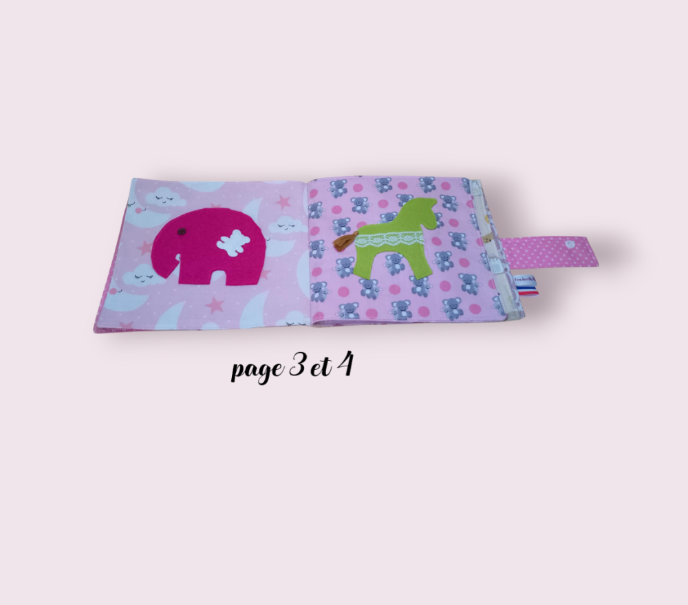 Il est composé de 10 images. Ce dernier peut être manipulé sans risque par bébé, les images sont cousues à la machine et tous les accessoires décoratifs et sensoriels sont cousus solidement à la main. Il se ferme à l'aide d'un bouton pression.