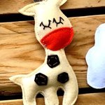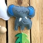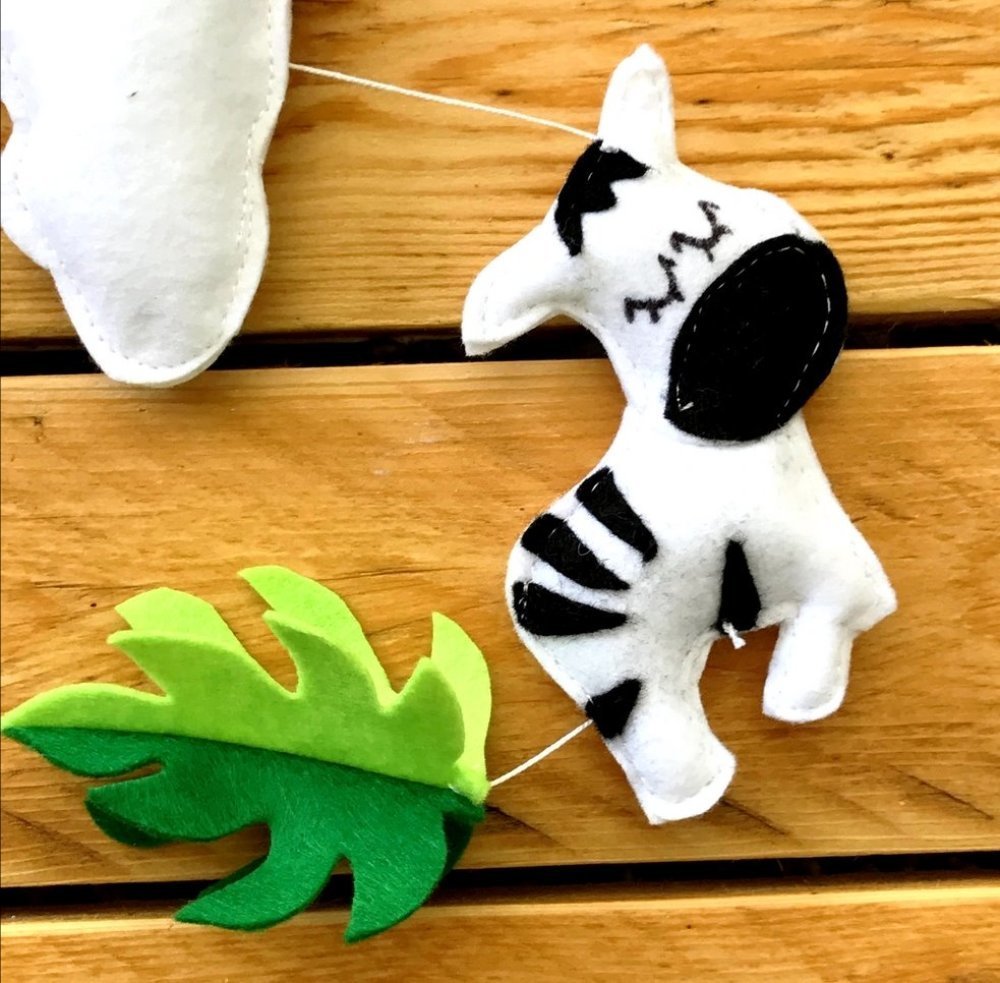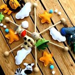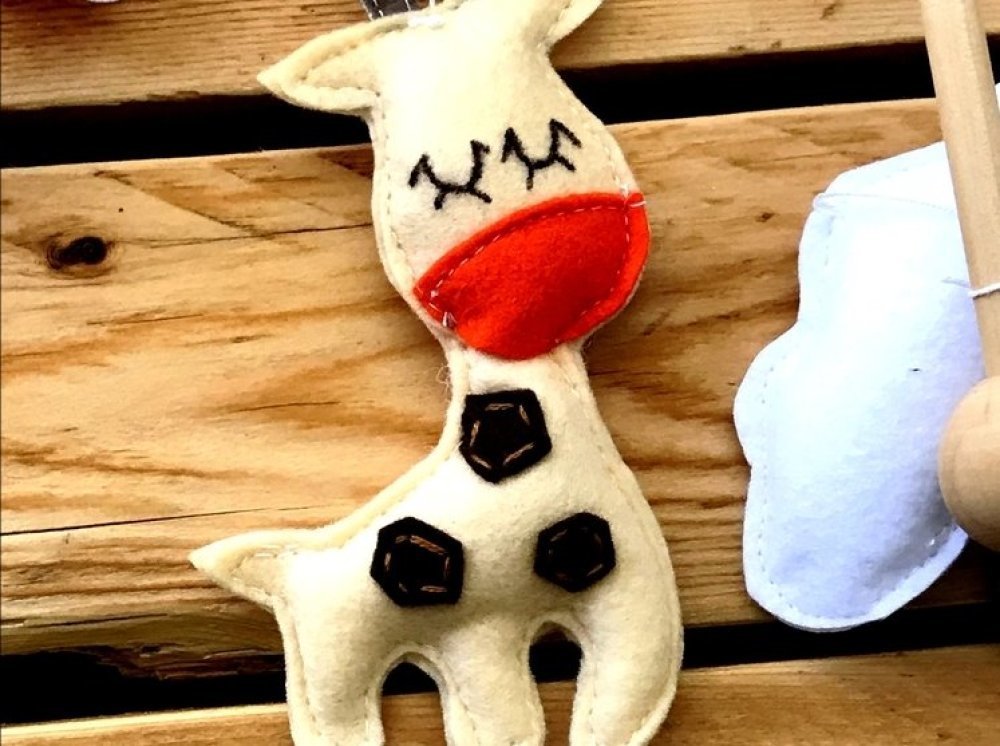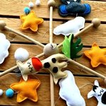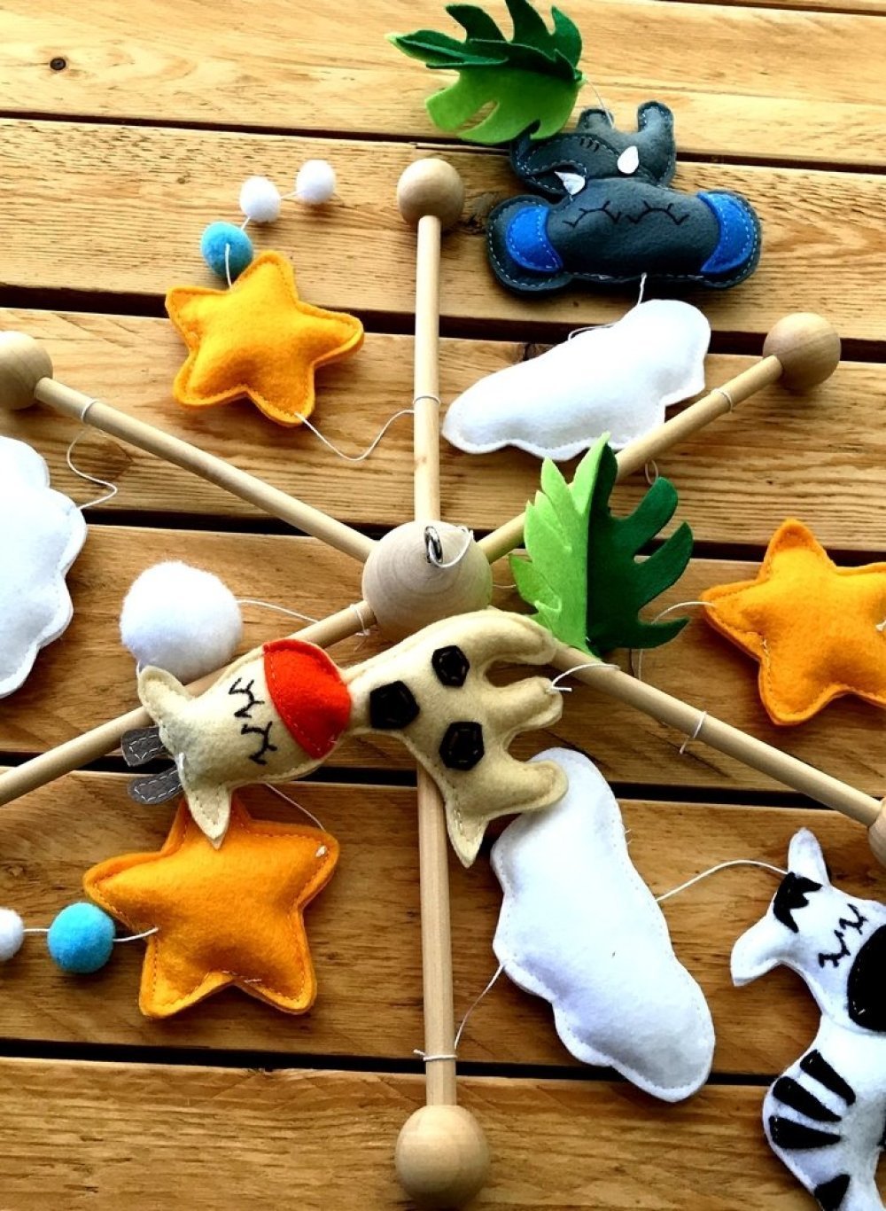 mobile enfantin réalisé en feutrine colorée et simili cuir.