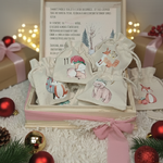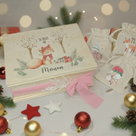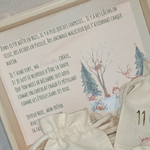 Dans cette boîte en bois, gravée au prénom de l’enfant, se cache un calendrier enchanté… 24 pochons en coton écru, illustrés de petits animaux de la forêt — renards malicieux, lapins rêveurs, ours câlins — chuchotent des secrets doux à découvrir chaque jour de décembre. Les pochons sont numérotés de 1 a 24 en lettres dorés