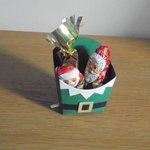 Boîte réalisé en papier Maya vert décoré d'une collerette blanche et d'une ceinture de Père Noël.