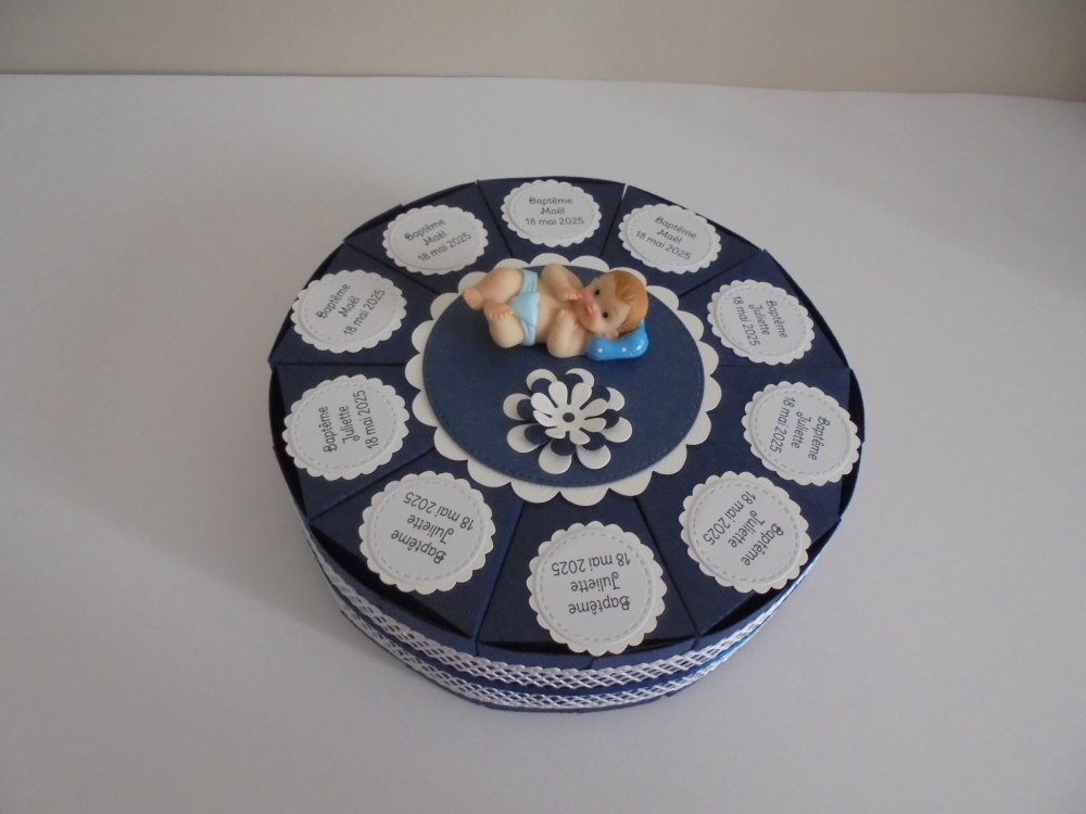 Ces boîtes sont décorées d'un médaillon dentelé posé sur un cercle avec l'inscription du prénom de l'enfant et la date de la cérémonie .