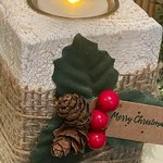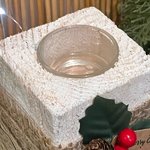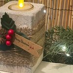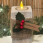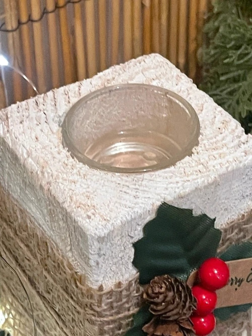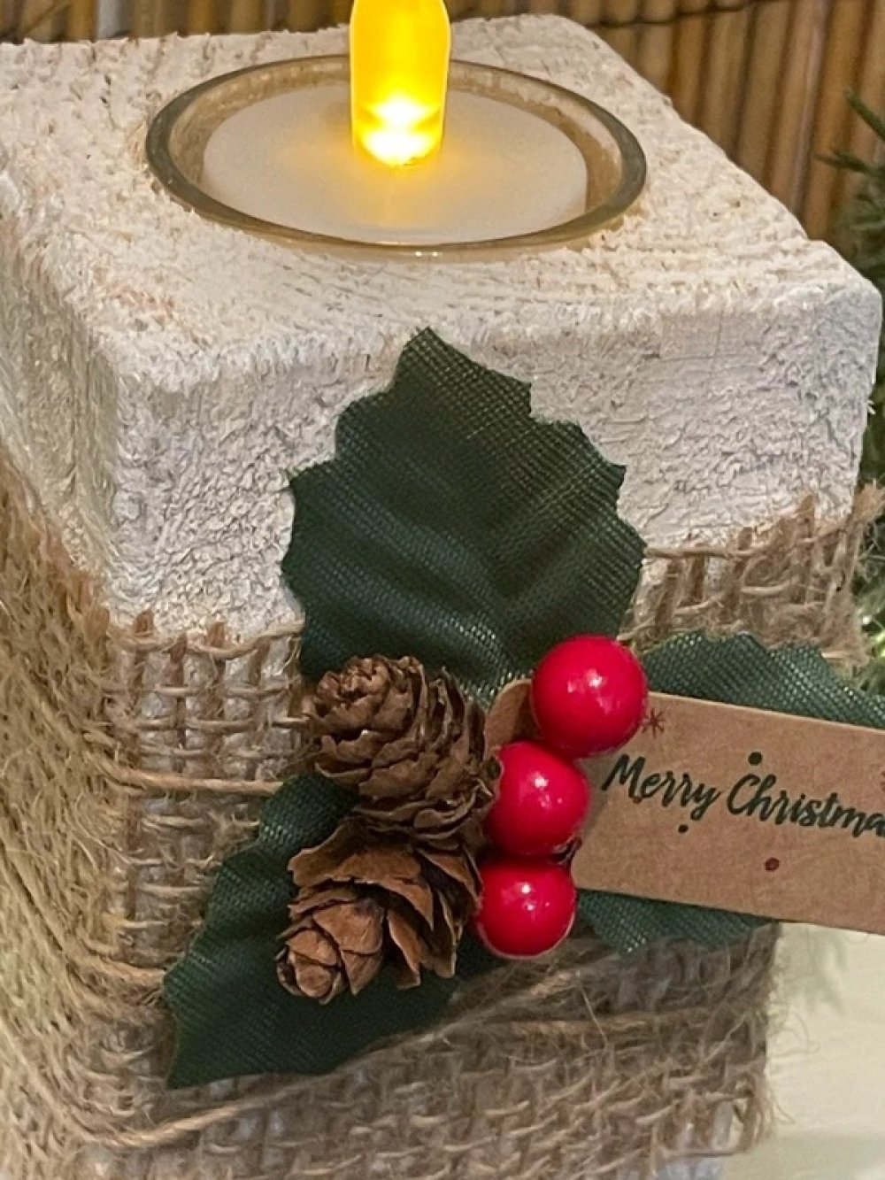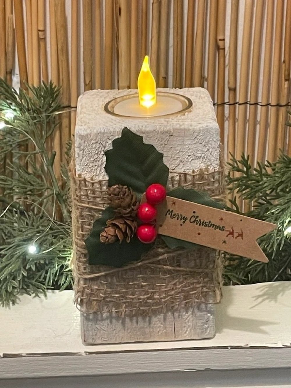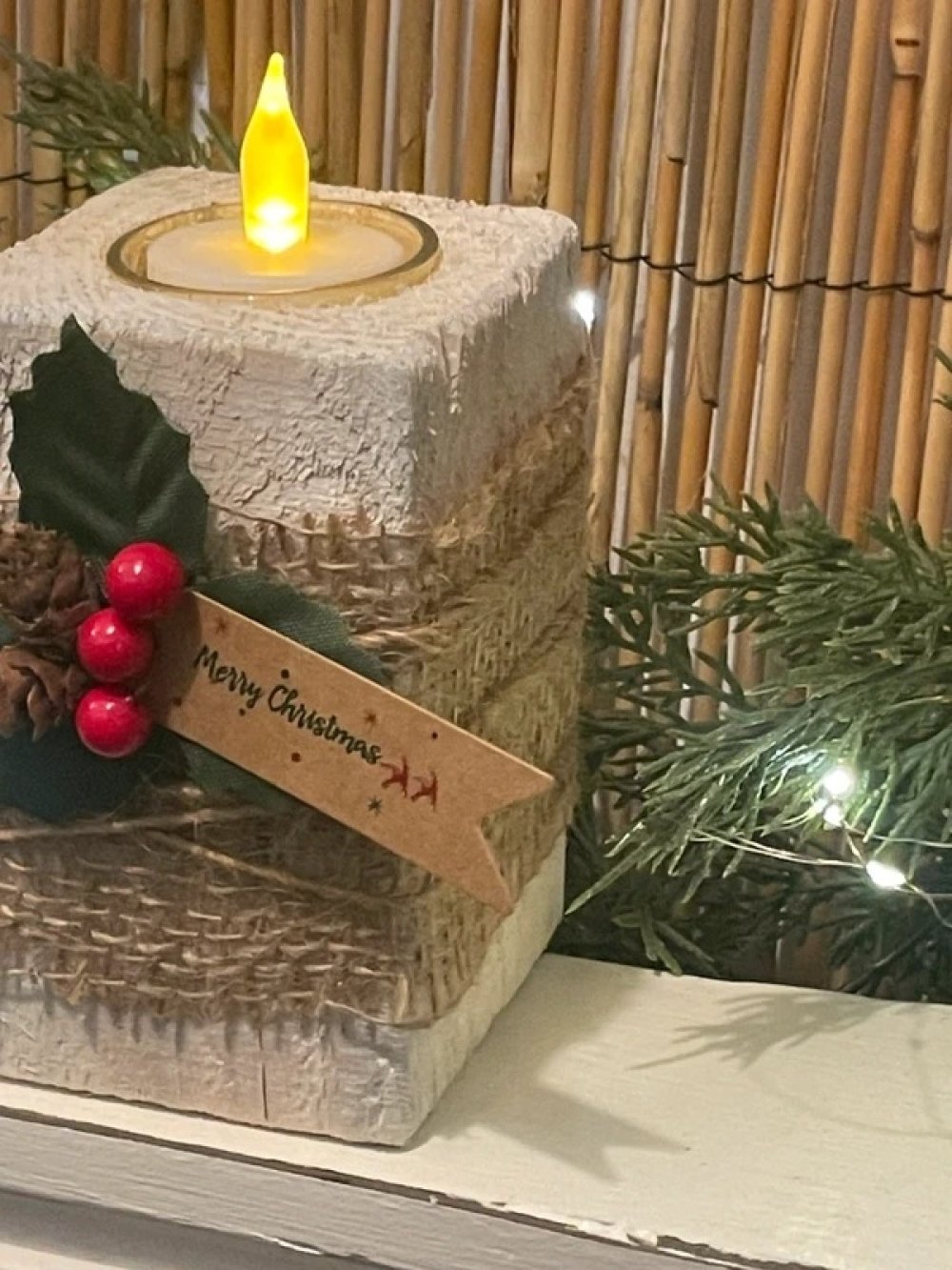 Je vous propose ce bougeoir en bois, décoré de jute, de verdure artificielle et d’un noeud.
