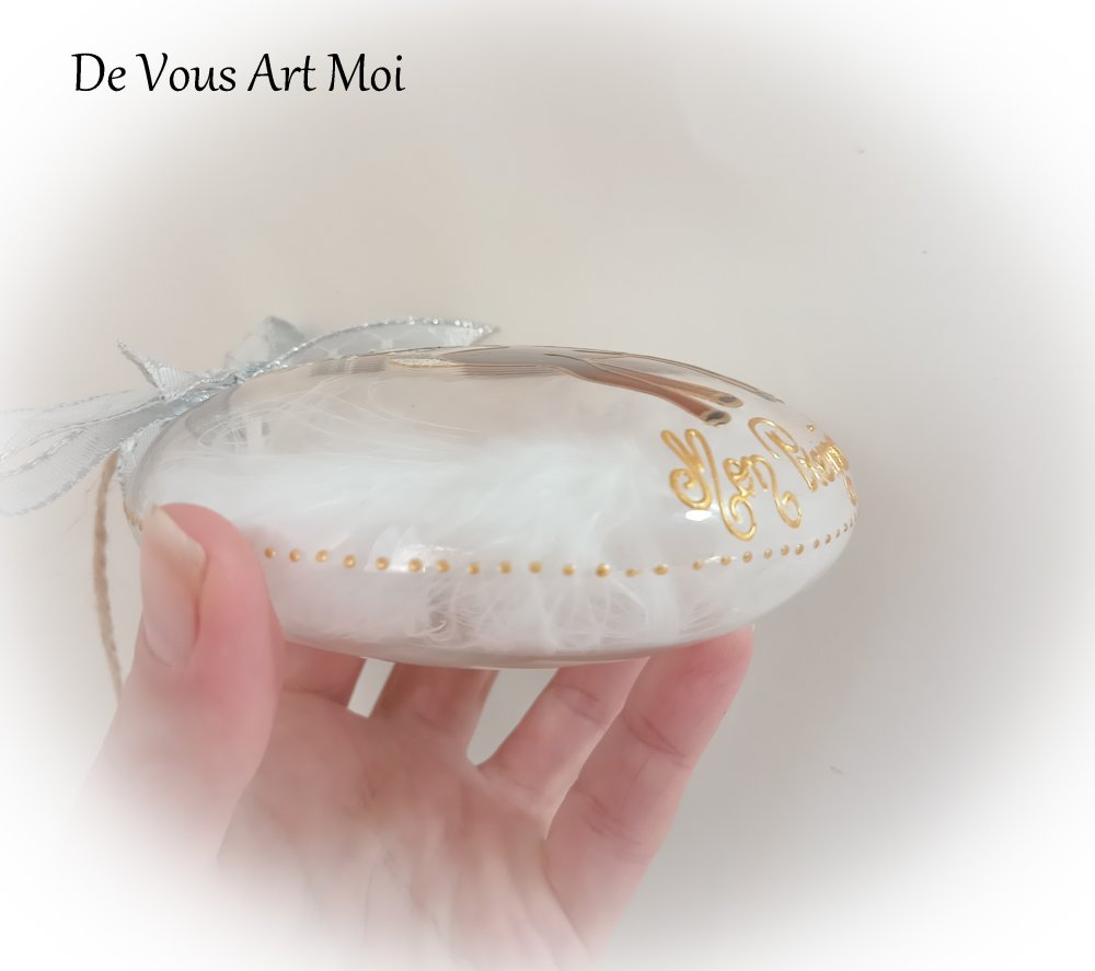 Une jolie boule sur laquelle je vous propose d’inscrire le prénom ou un petit mot doux à la personne à qui vous souhaitez l'offrir (écriture en doré)!!!un véritable cadeau personnalisé et unique pour une personne pas comme les autres!!!!!!!!!!!!!!! Un bien joli cadeau,merveilleux souvenir d'enfance à garder toute la vie et à redécouvrir chaque année au moment de décorer le sapin de Noël!