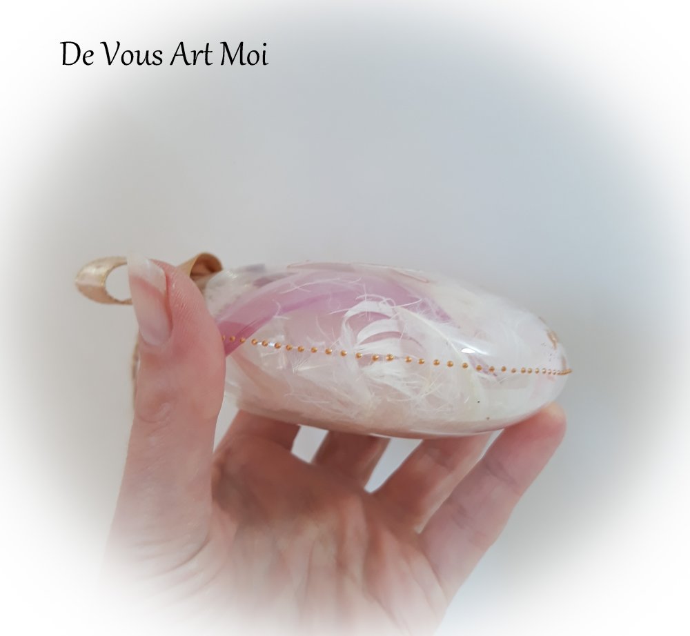 boule plate en verre remplie avec des plumes blanches et crèmes et roses