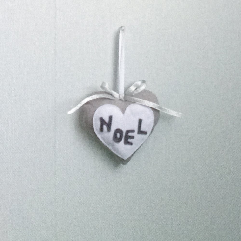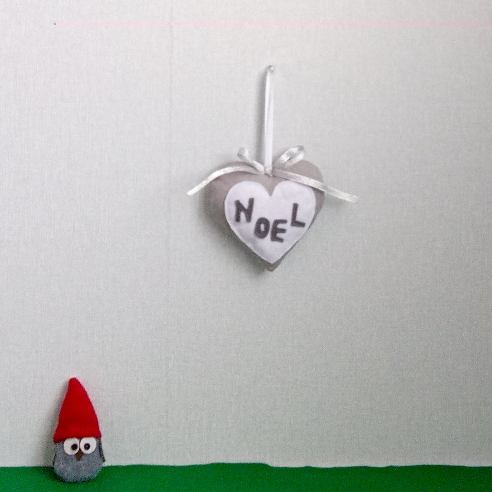 Ce cœur artisanal, réalisé dans un tissu gris en coton et polyester, est sublimé par un cœur en feutrine blanche sur lequel sont cousues les lettres du mot Noël en feutrine grise. Chaque détail, du ruban argenté brillant au ruban blanc suspendu, a été pensé pour créer une déco harmonieuse, raffinée et chaleureuse.