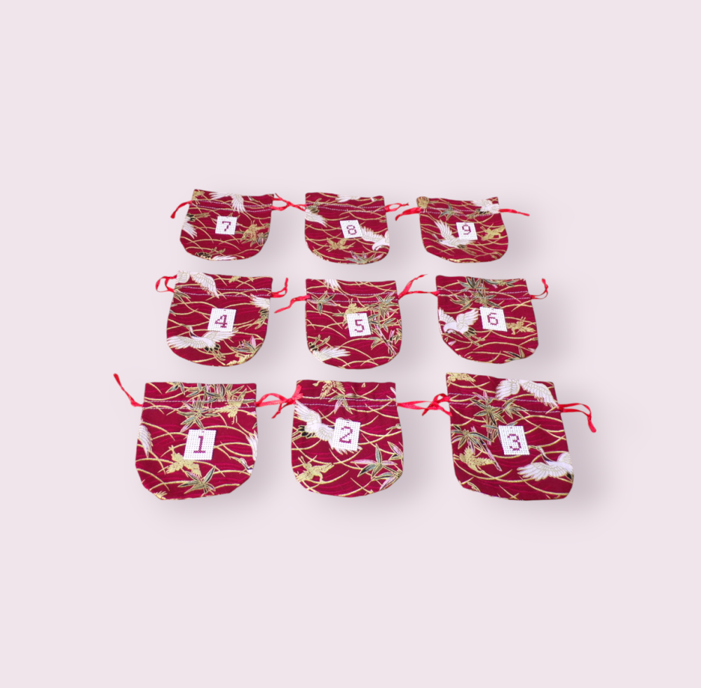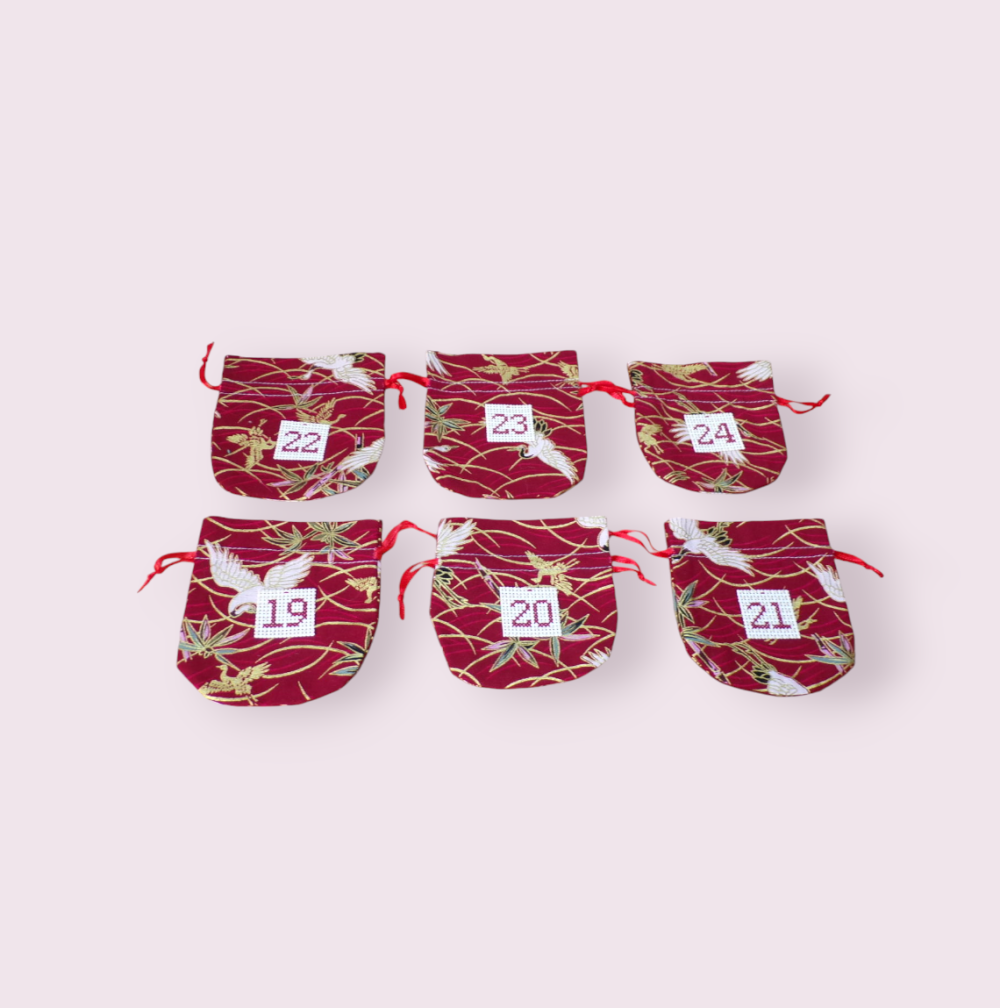 Sur chacun d'entre eux est cousu un carré brodé main avec les chiffres de 1 à 24 (voir les photos). Lien de serrage en ruban de satin rouge. Dimensions des petits pochons 9,5 x 10 cm