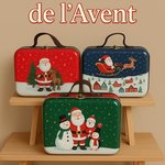 calendrier de l'avent dans une petite valisette en métal au décor de noël rempli de décorations en bois et d autocollants de noël.
