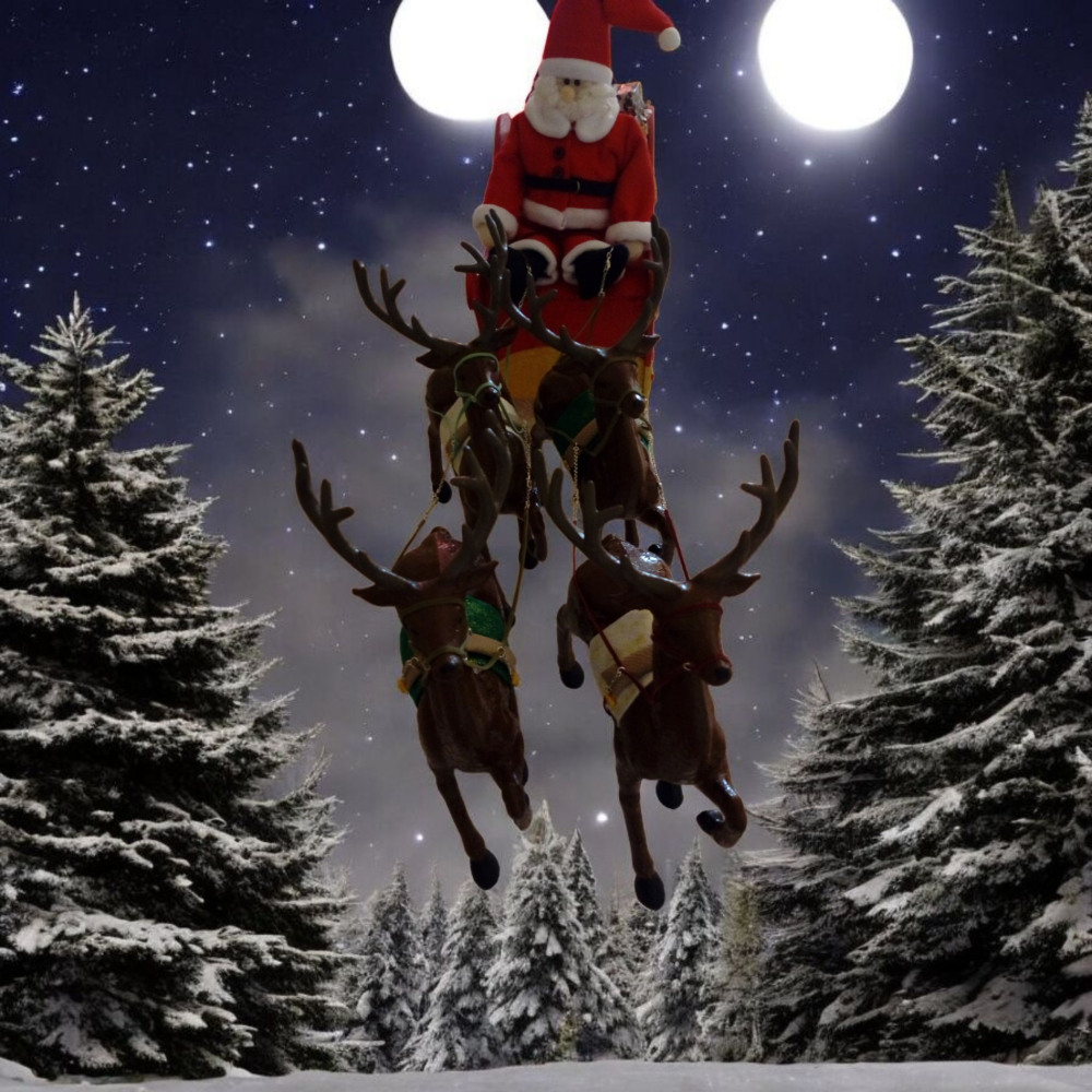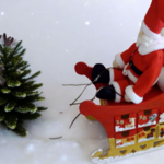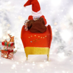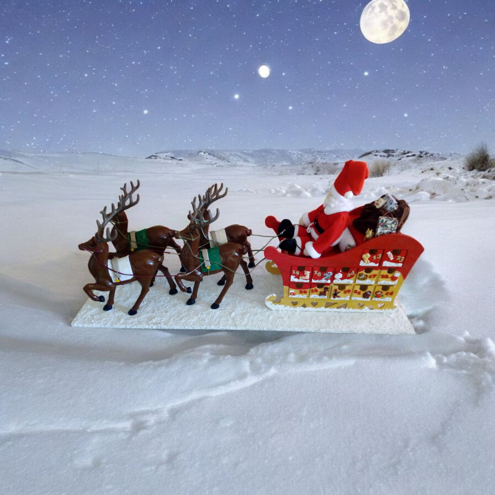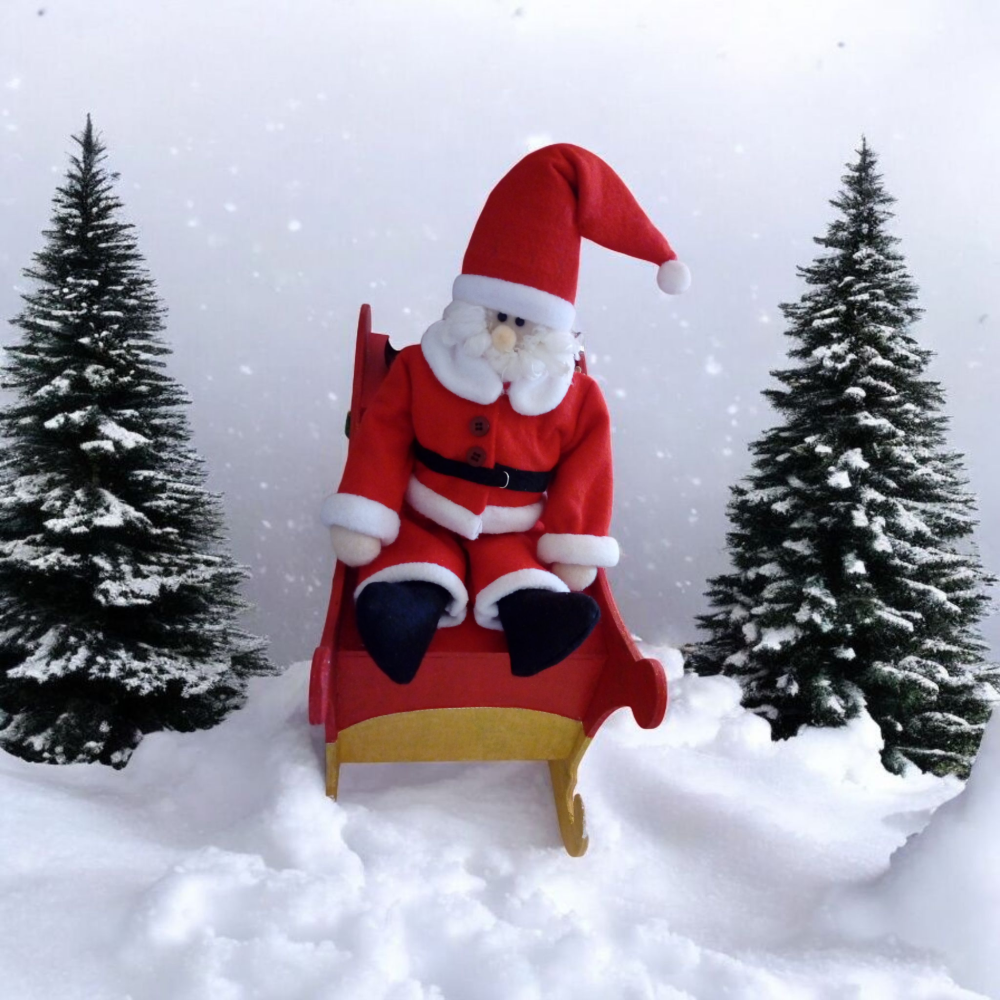 Pour encore plus de charme, j’ai relooké des rennes avec peinture et harnachement, et le Père Noël, sorti de mon atelier de couture, avec son petit coussin pour le dos et son sac rempli de cadeaux. Le traîneau et les rennes reposent sur une plaque en bois recouverte de fausse neige, pour une touche magique.