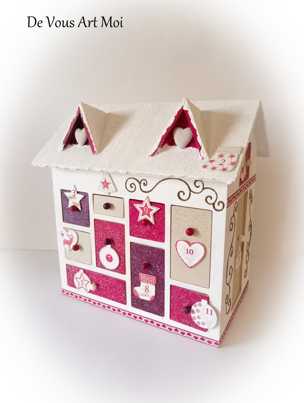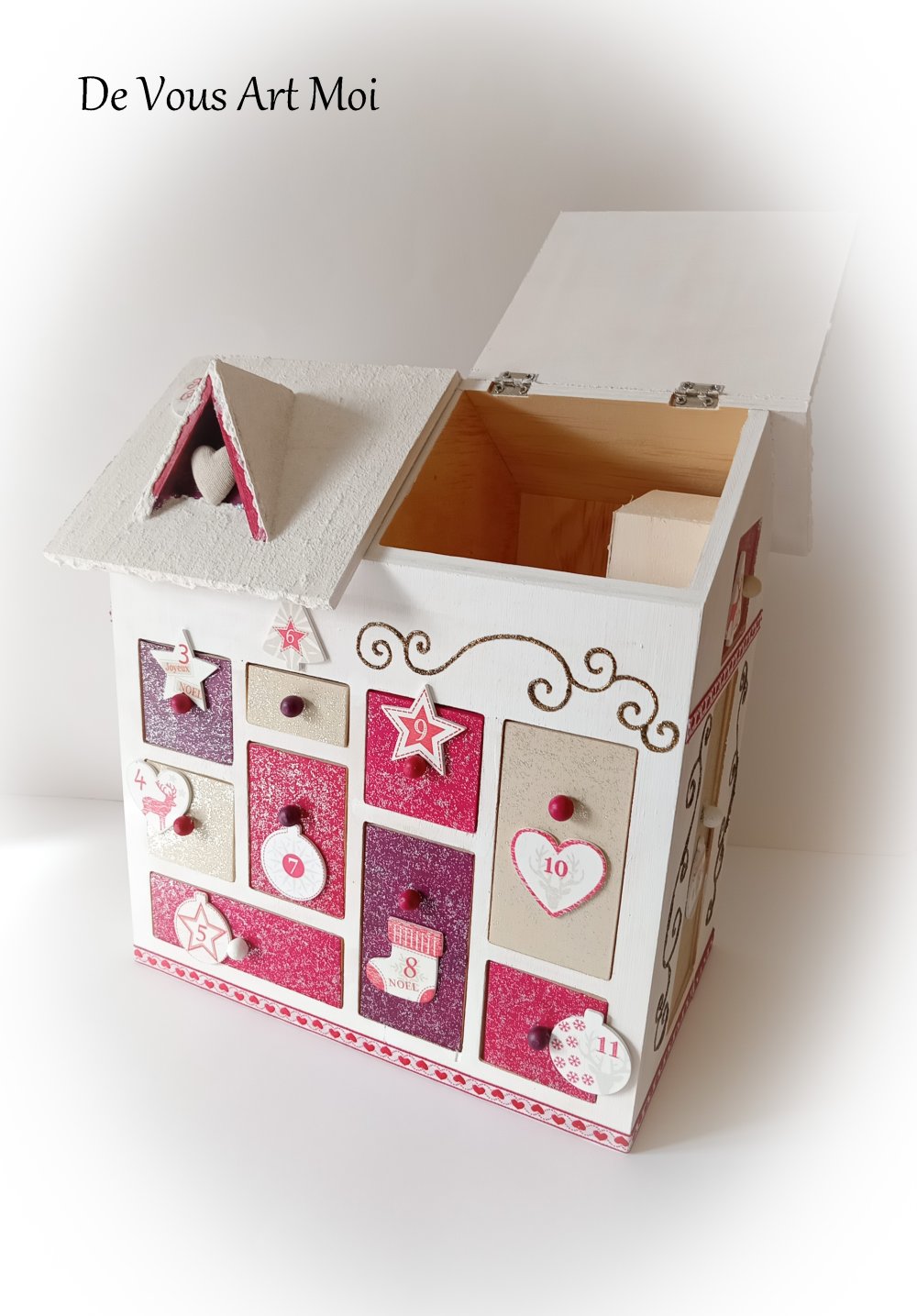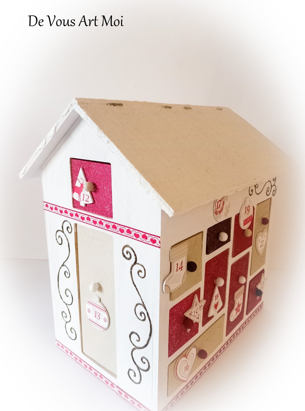 Le calendrier se présente sous forme d'un chalet en bois composé de tiroirs de taille différentes pour accueillir des petits présents ou des gourmandises de Noël(sous le toit,sur chaque façade et de chaque coté)