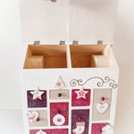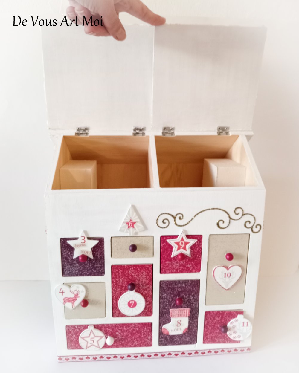 Du 1ier au 24 décembre,on ouvre progressivement un cachette(un tiroir) par jour selon le numéro indiqué et on découvre le présent qui se trouve à l'intérieur...