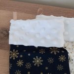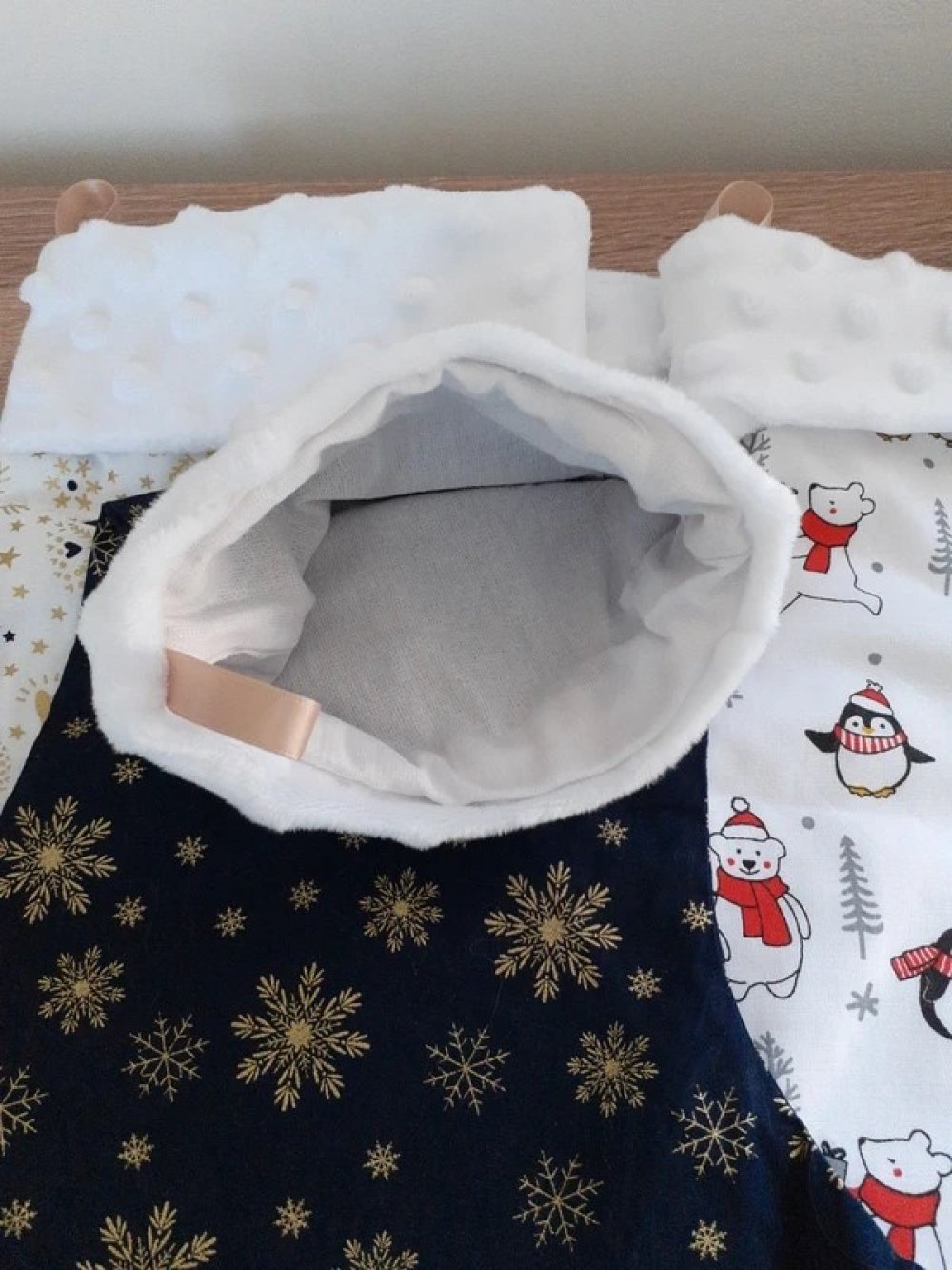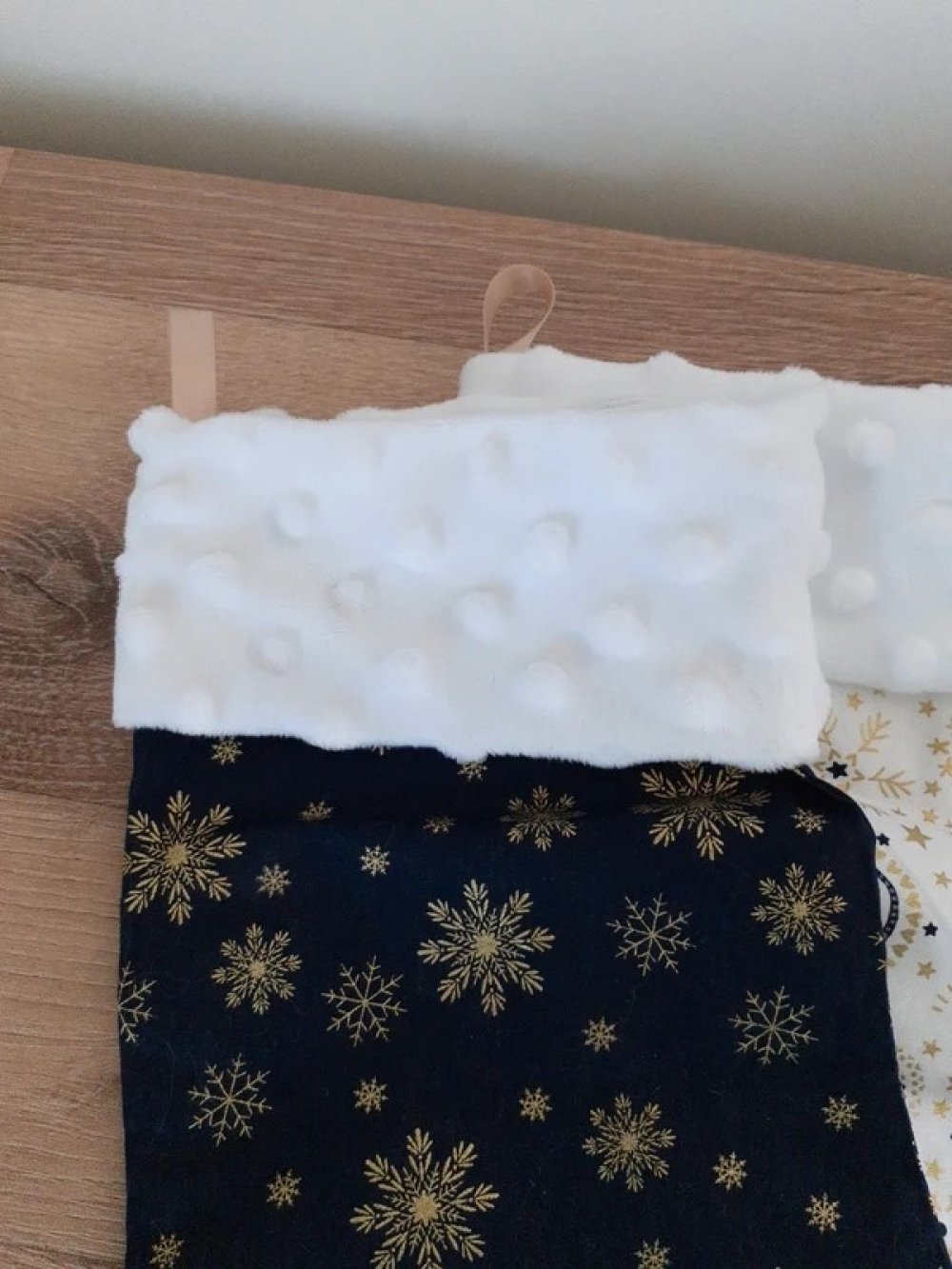 Tissus blanc aspect fourrure pour le haut de la botte. Petite attache en satin beige pour les accrocher.