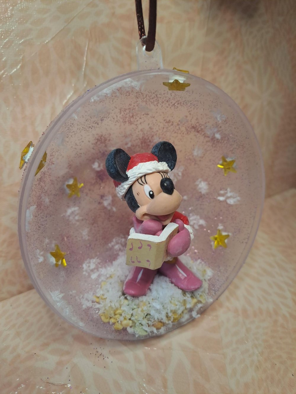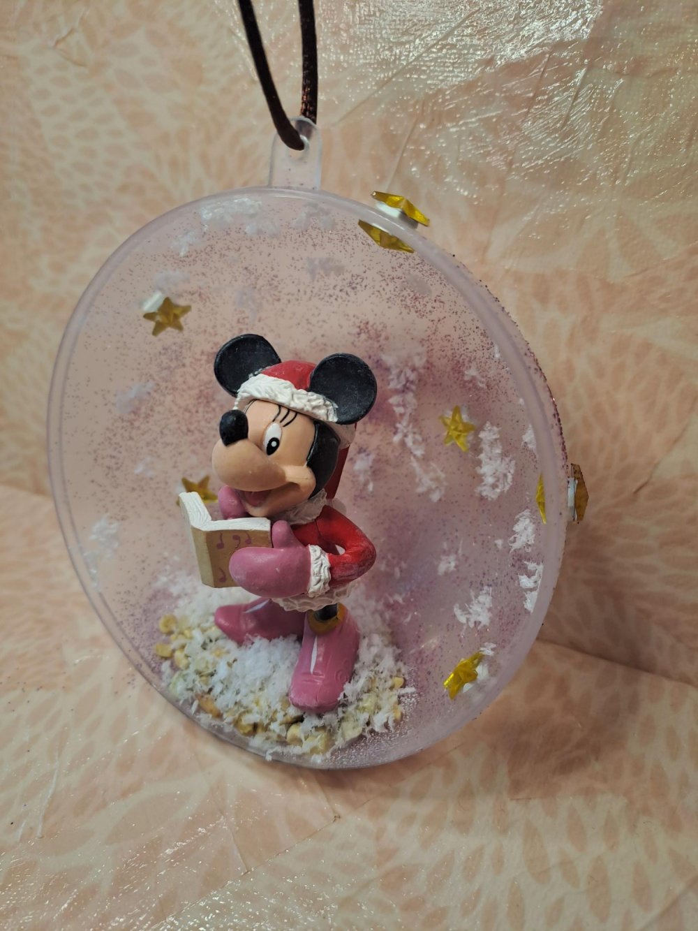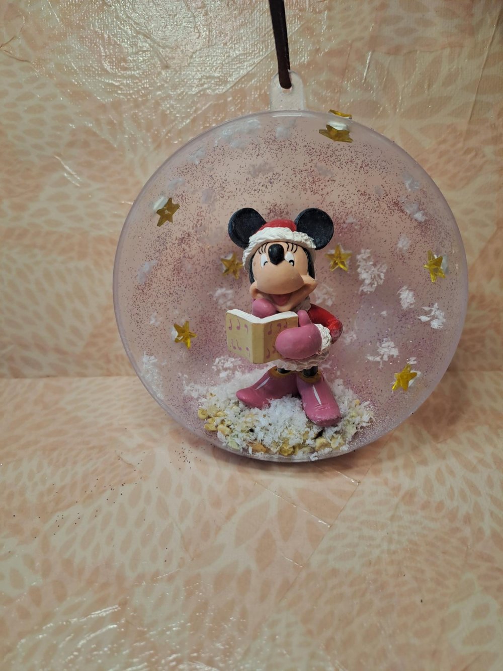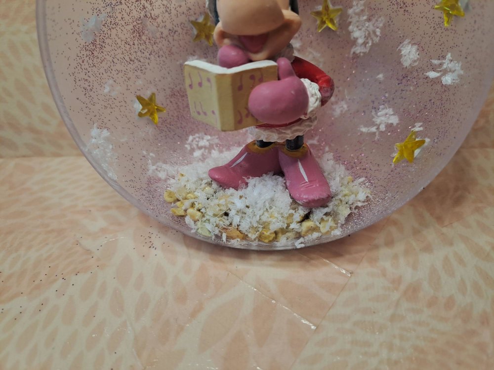 Demi-boule de Noël avec une figurine d'occasion Disney de Minnie, ici en tenue de chanteuse de Noël.