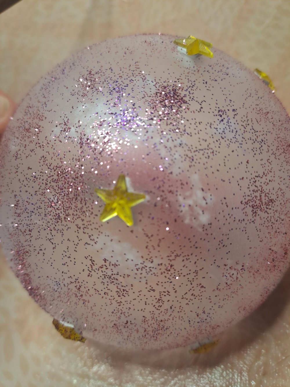 "Sol" en petit cailloux type aquarium et fausse neige. Etoiles collées à l'intérieur et à l'extérieur de la demi-boule, ainsi que de la fausse neige collée sur la paroi.