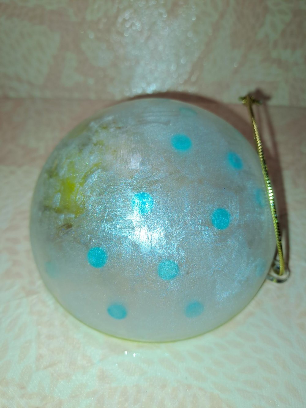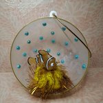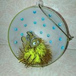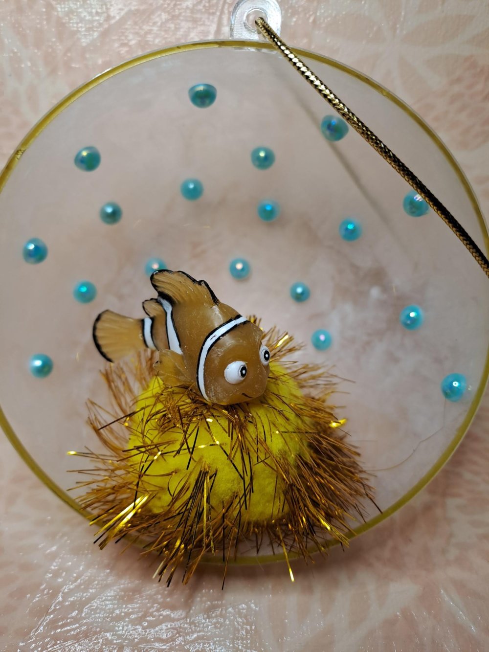 "Sol" avec une boule pompon jaune et or. Cabochons bleu ciel collés à l'intérieur de la demi boule. Extérieur de la boule au vernis effet givré et extrémité au posca doré.
