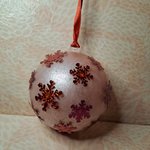"Sol" avec des morceaux de bois ressemblant à des tiges de bambous. Sequins flocons fushia et rouges à l'extérieur de la demi-boule. Contour de la boule au vernis pailleté doré rose.