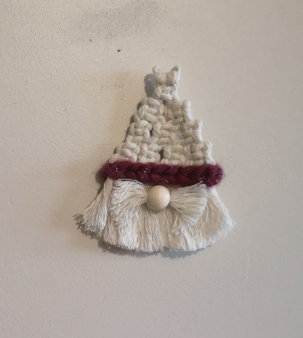 Sa barbe et sa moustache sont en coton peigné et son nez est une perle de bois. Son bonnet est orné d'une tresse en laine brillante.