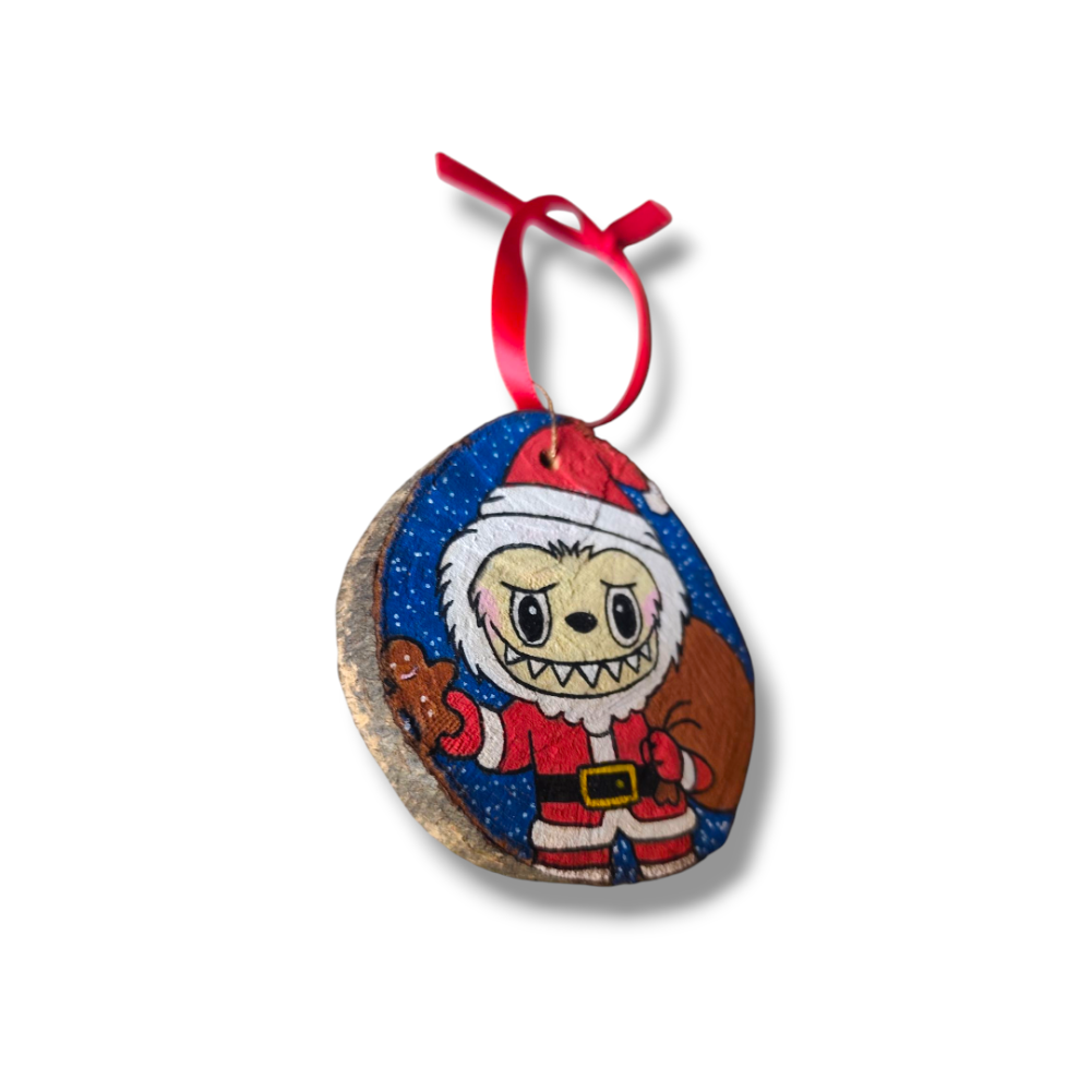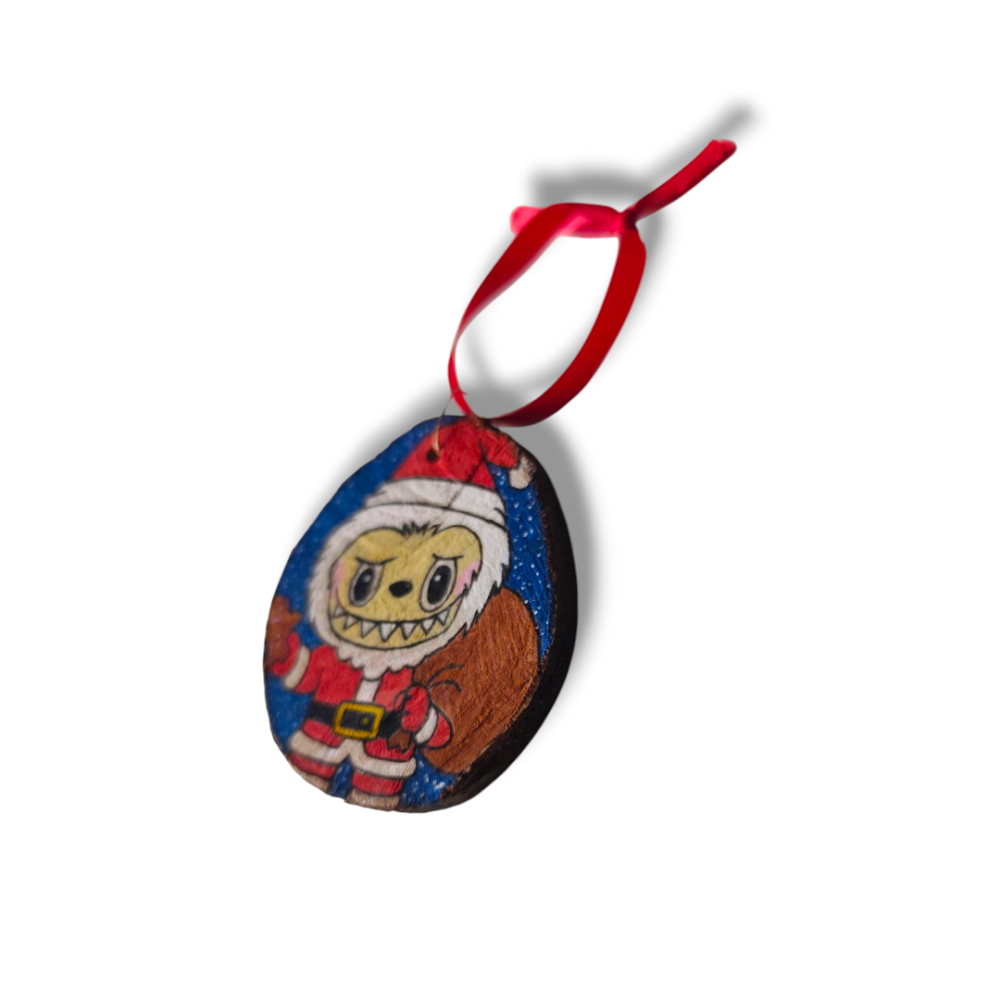 Voici Labubu en version Père Noël, peint à la main sur une véritable rondelle de bois 🌲🎅