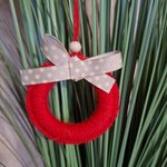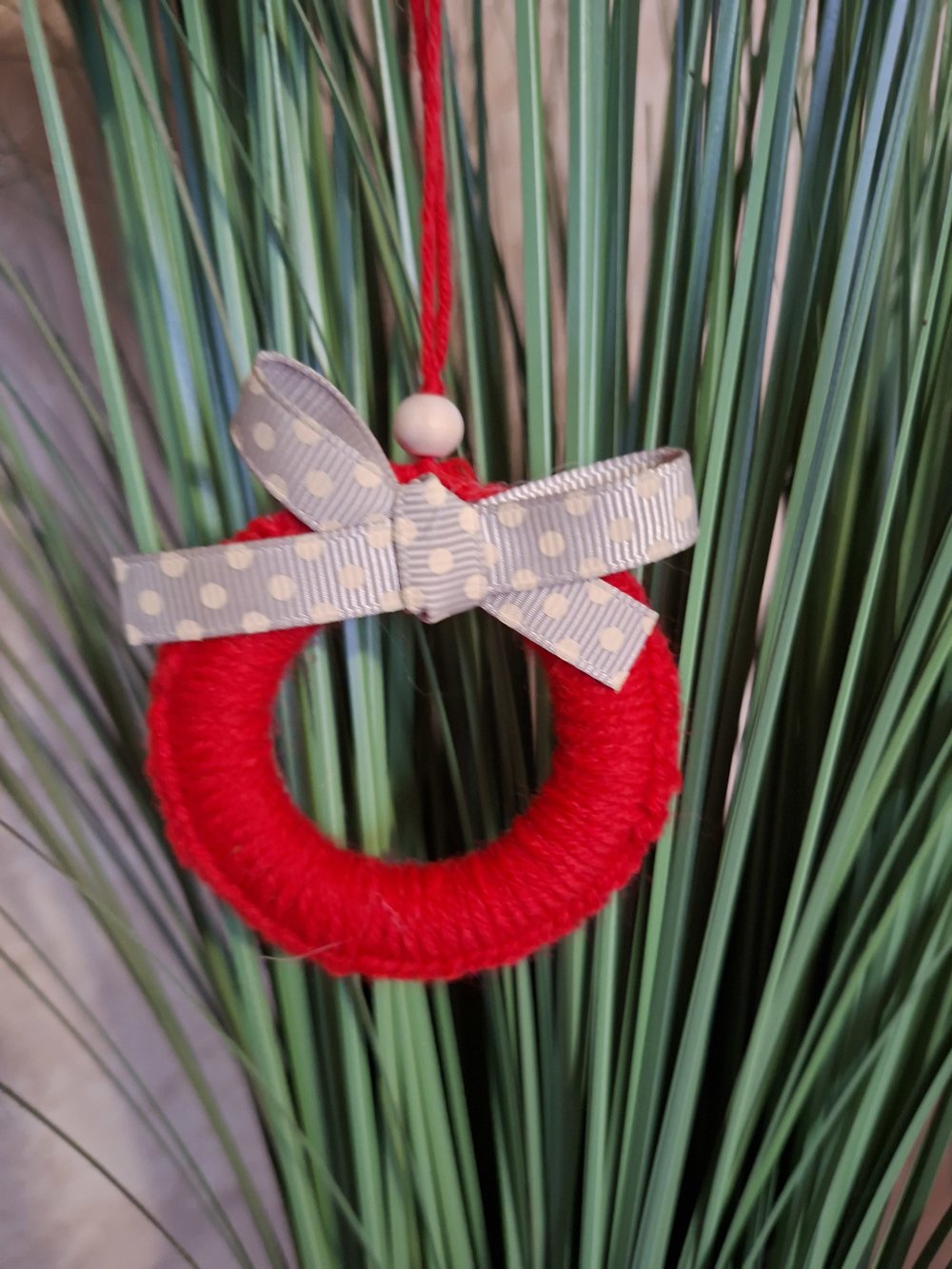 - Anneau en bois recouvert au crochet d'une laine de couleur rouge