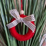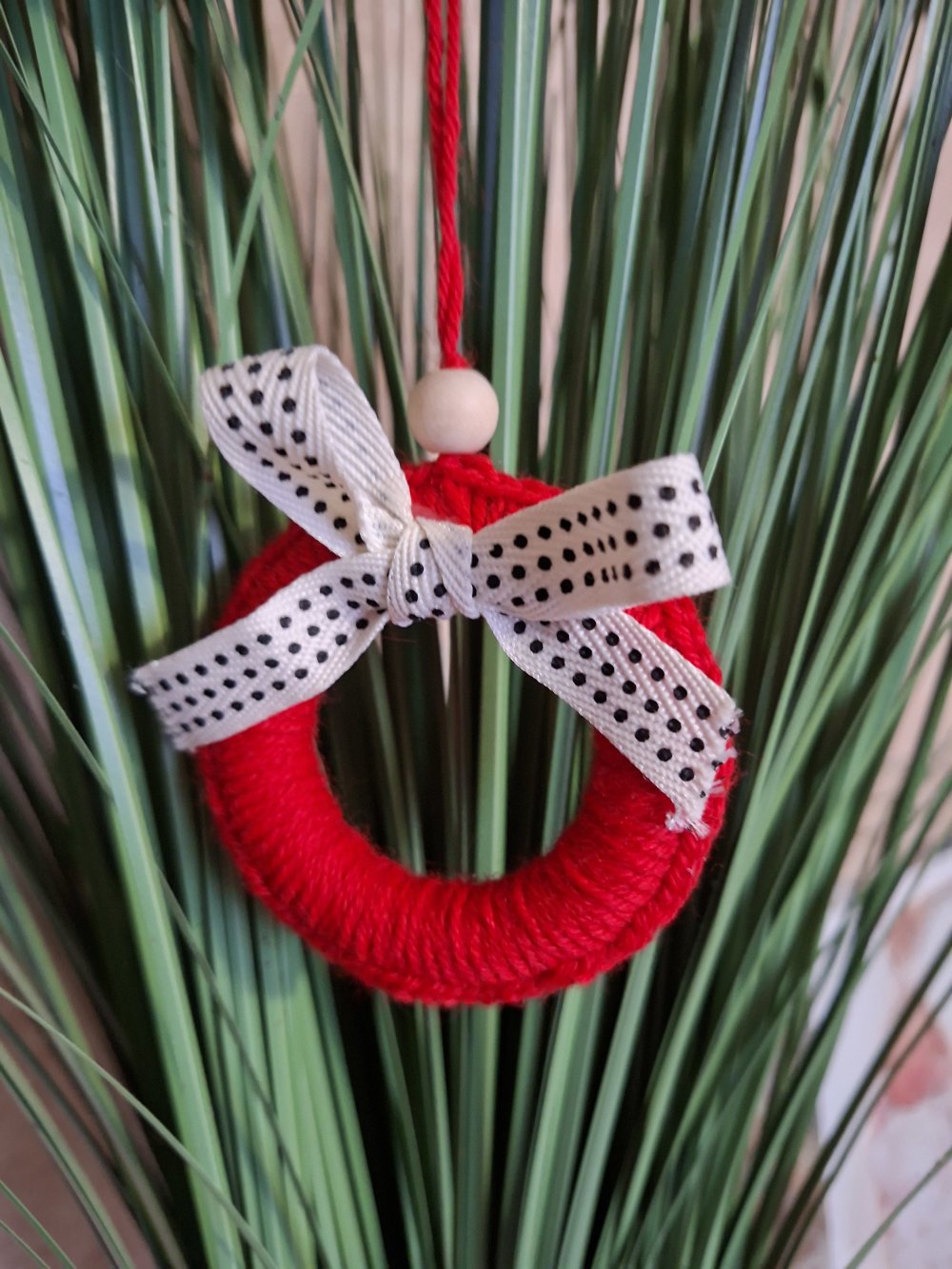 - Anneau en bois recouvert au crochet d'une laine de couleur rouge