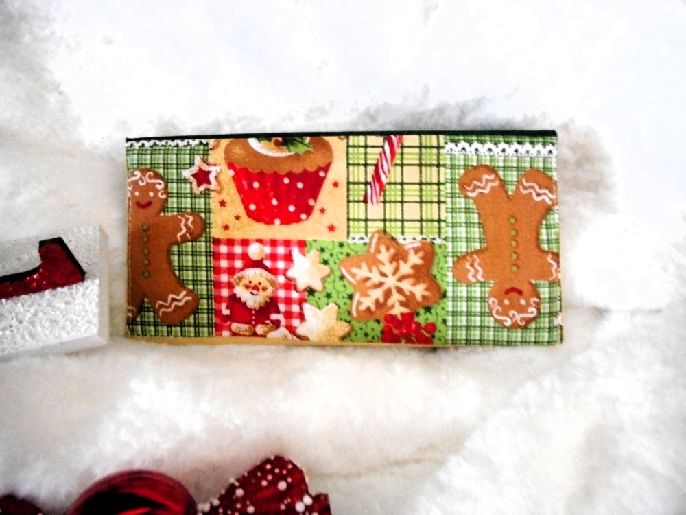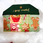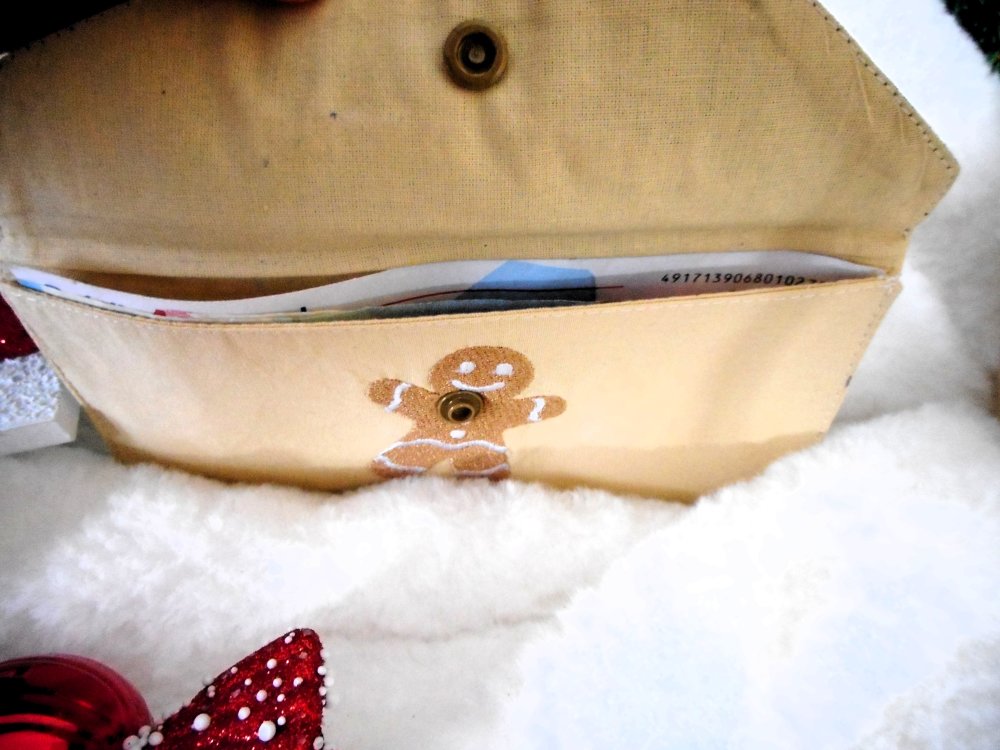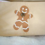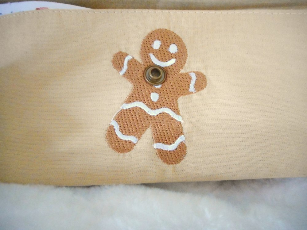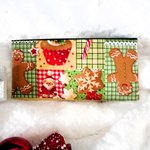 Pochette cadeau en coton beige, avec un bonhomme en pain d'épices brodé (gingerbread man), le dos est en coton imprimé d'un effet de patchwork de Noël.