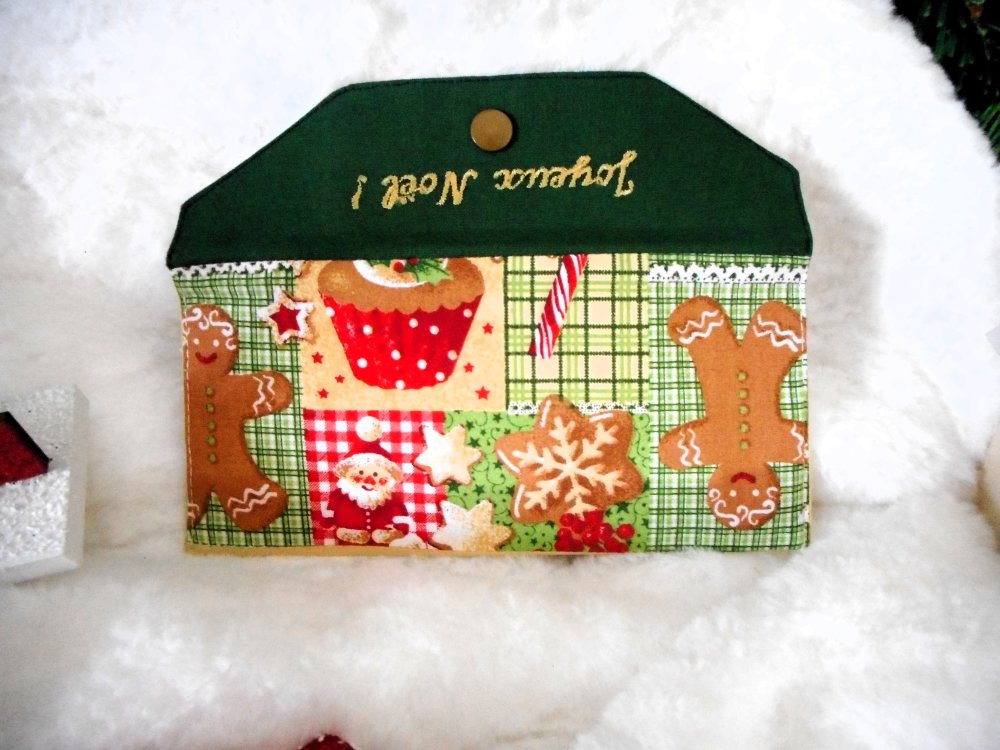Le rabat est en coton vert, "Joyeux Noël ! "est brodé en doré.