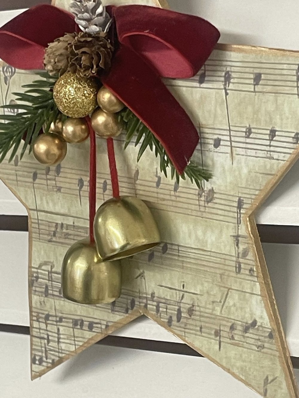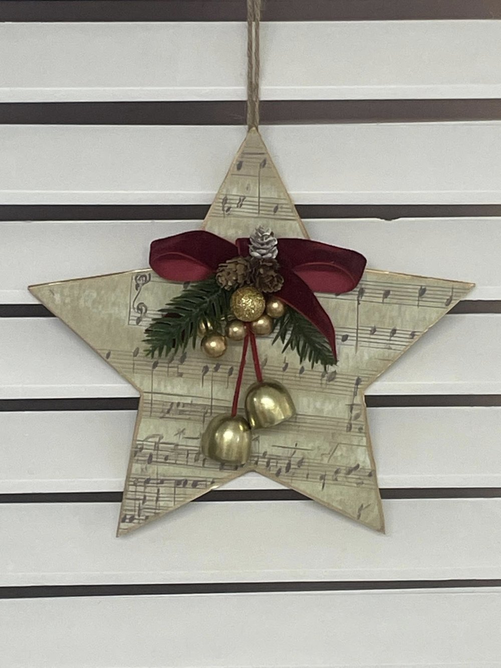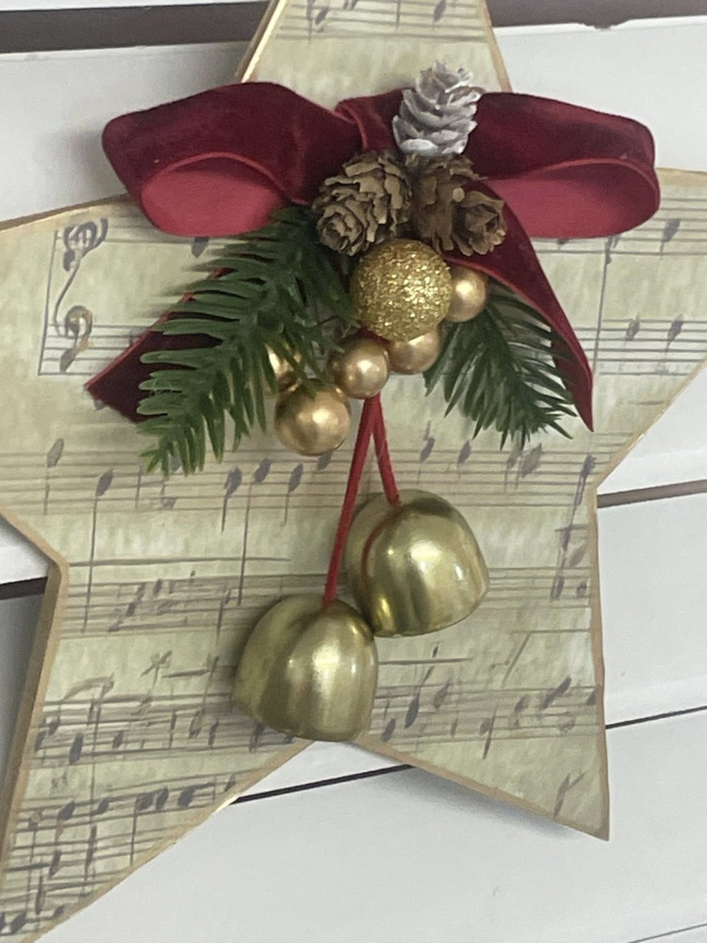 Je vous propose cette étoile en bois, décorée d’un papier de style « musique » avec des contours et des reflets dorés, un ruban, de la verdure et des clochettes.