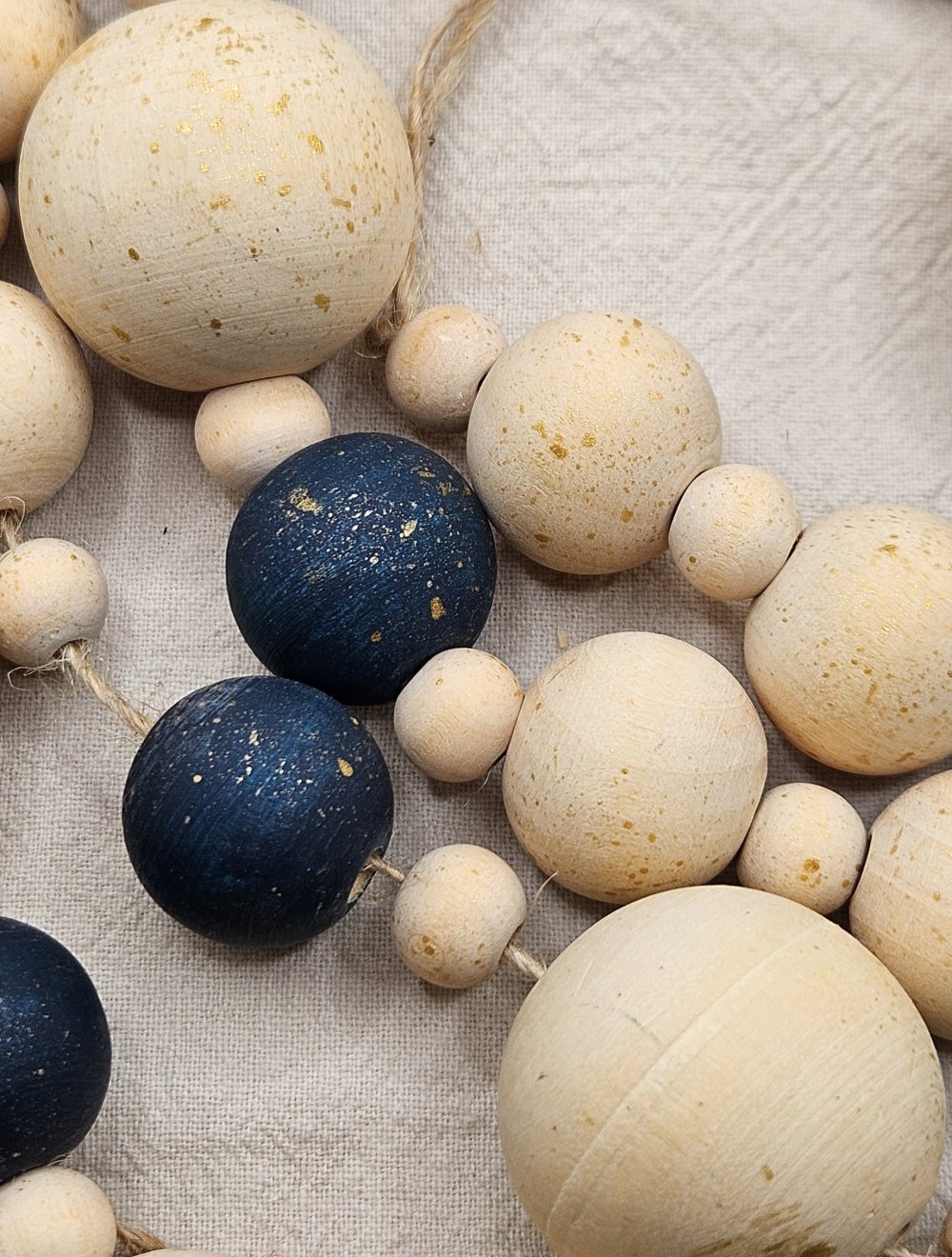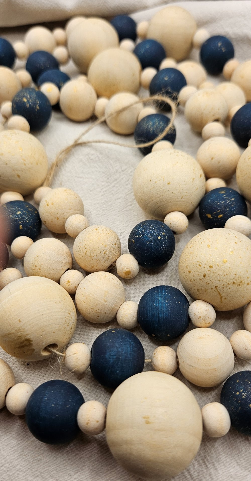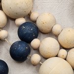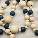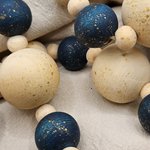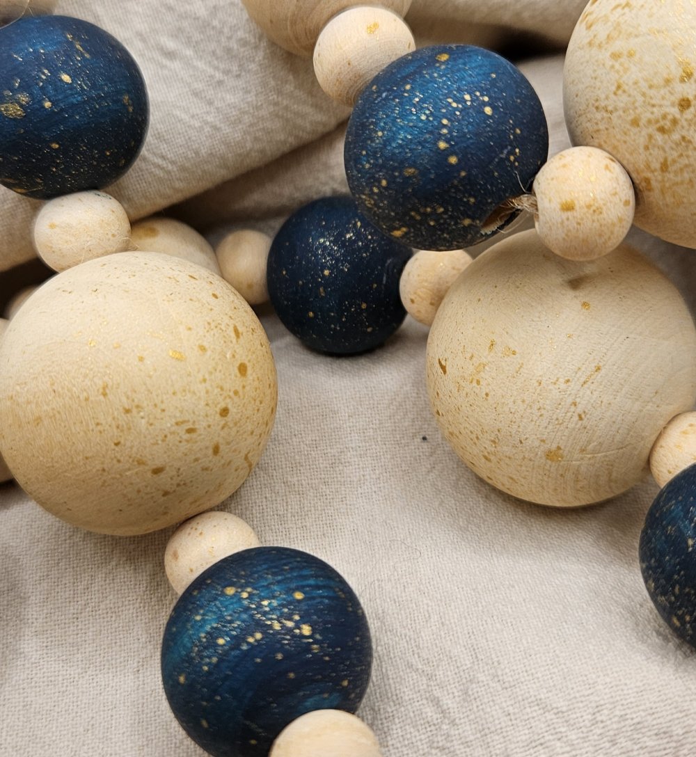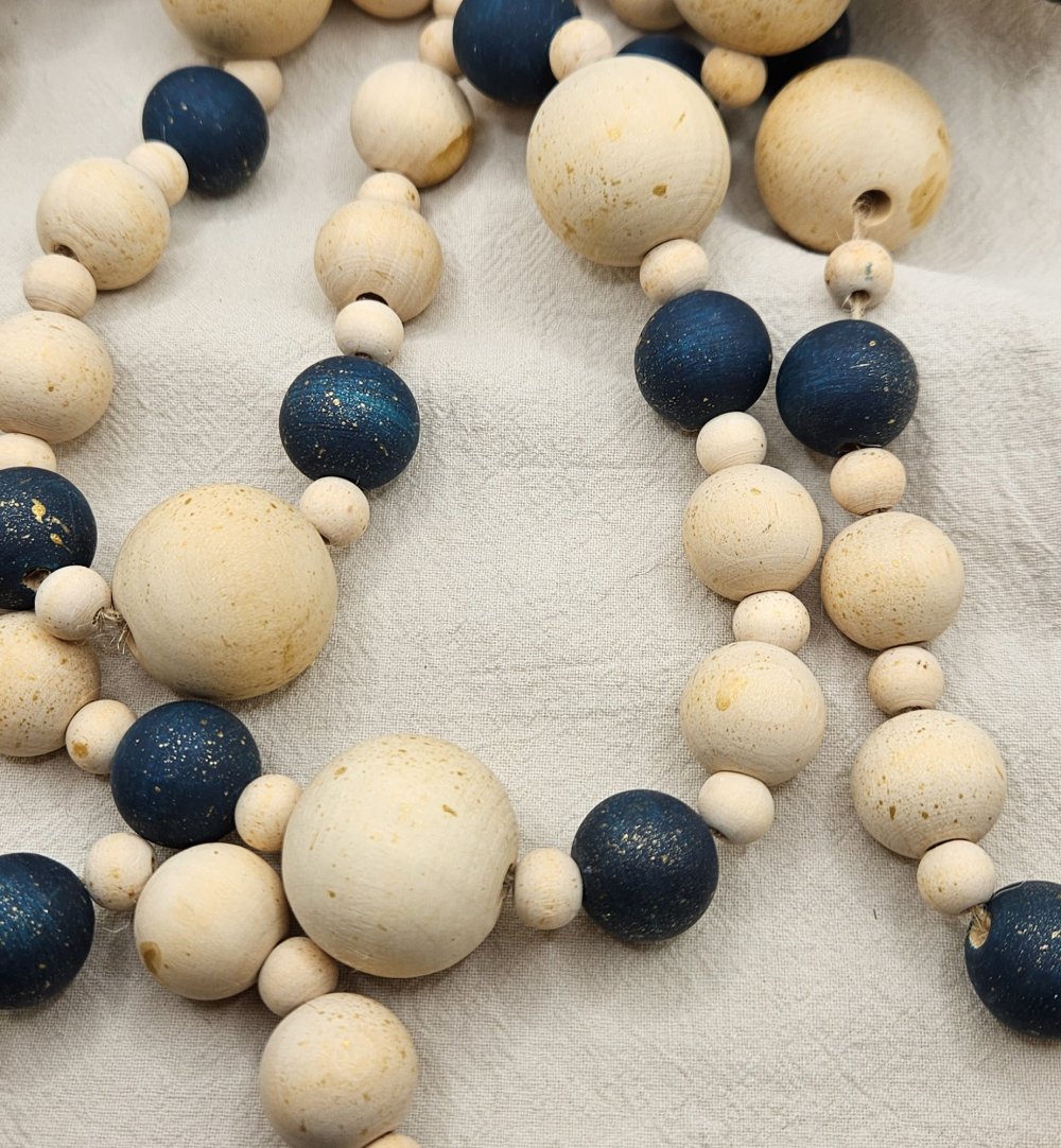 guirlande bois noël, décoration sapin bois, guirlande perles artisanale, déco bleu doré, décoration noël naturelle, guirlande scandinave, guirlande bois fait main