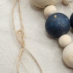 Les perles brutes sont associées à des perles bleu nuit peintes à la main, puis toutes sont rehaussées d’éclats dorés pour un effet festif et élégant ✨