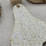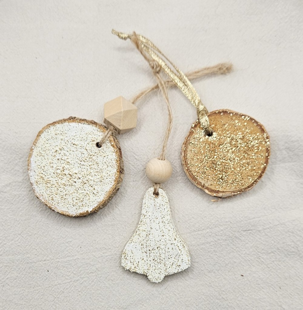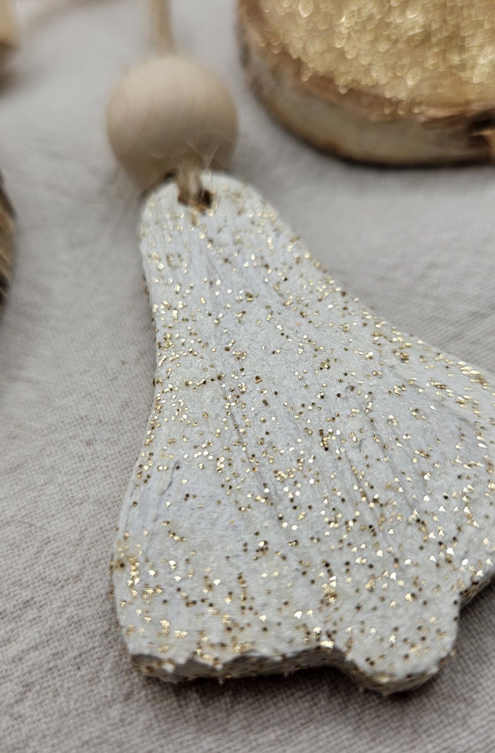Décorations de Noël en bois naturel, peintes à la main en blanc ou doré puis parées de paillettes fines couleur or. Lot de 3 pièces uniques : deux rondins percés et une cloche en bois recyclé, avec perles assorties et attaches en corde naturel