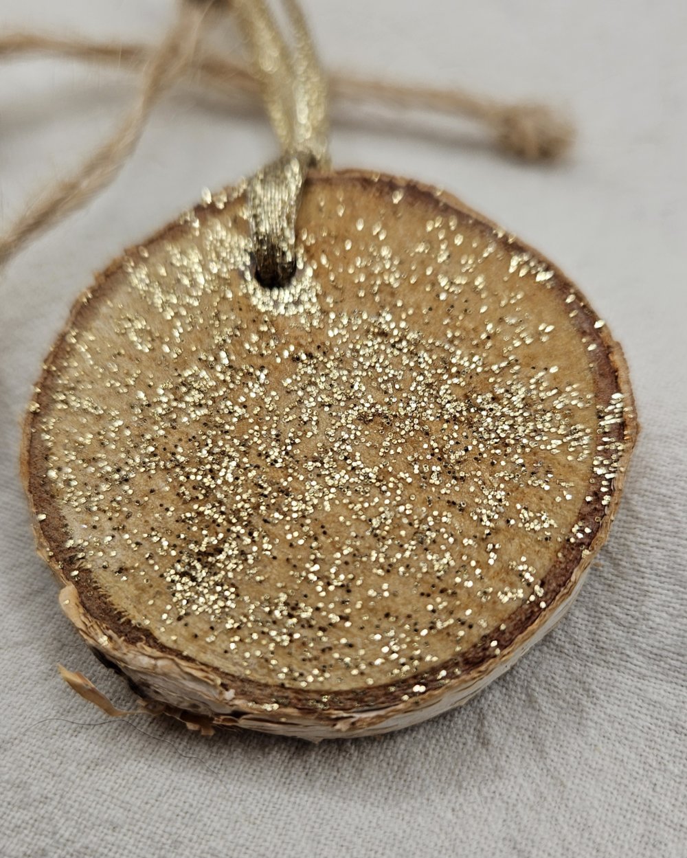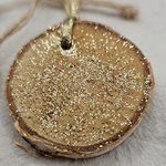 1 rondin naturel, entièrement pailleté or avec un ruban doré