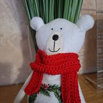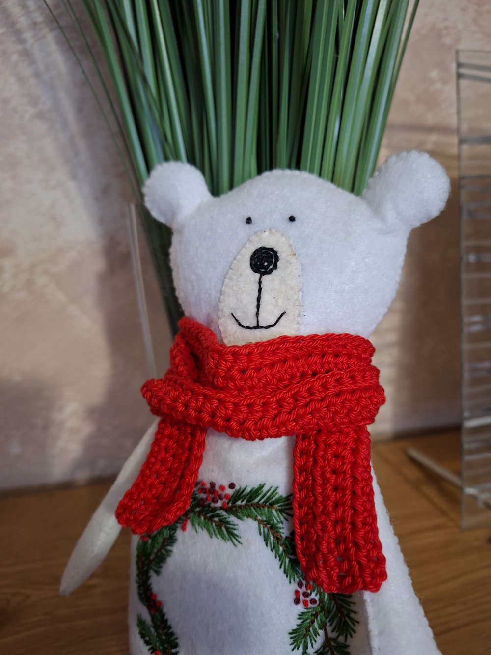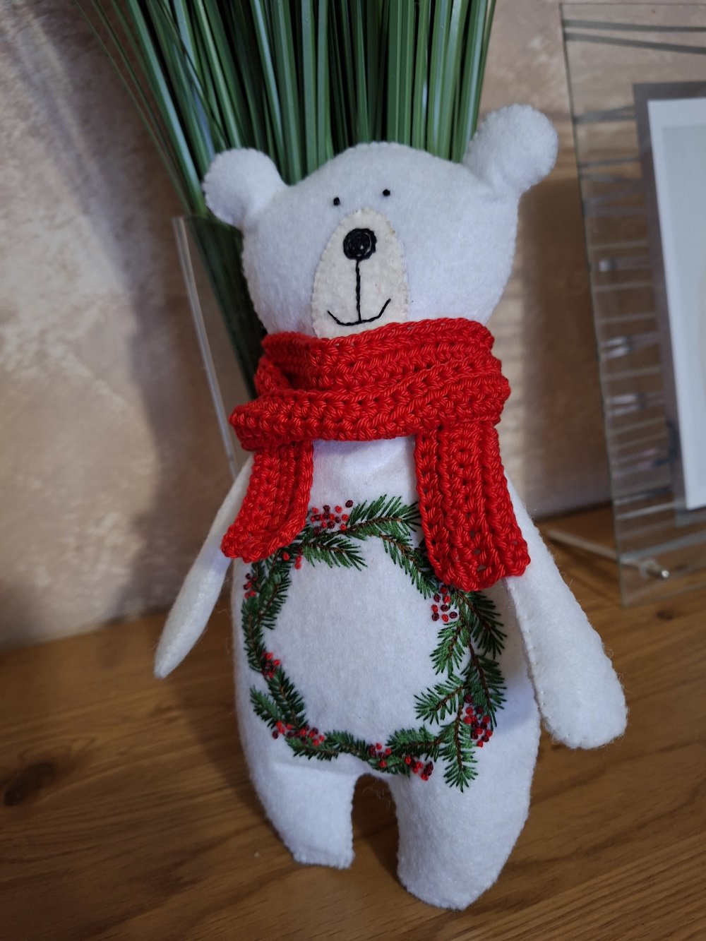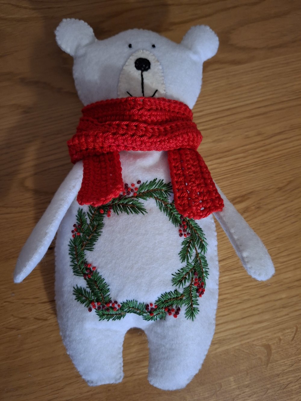 Ours polaire entièrement cousu et brodé à la main avec du fil DMC, réalisé en feutrine, décoré d'une jolie couronne de Noël, et bien au chaud dans son écharpe rouge crochetée. Un look parfaitement hivernal et chaleureux 🥰