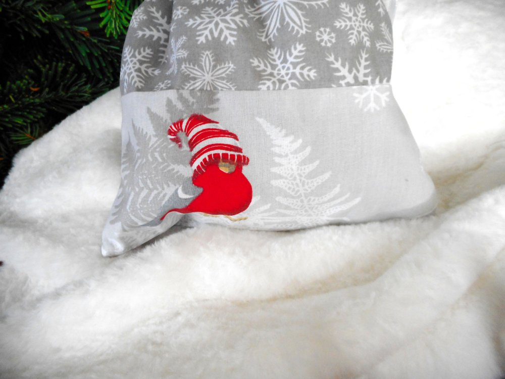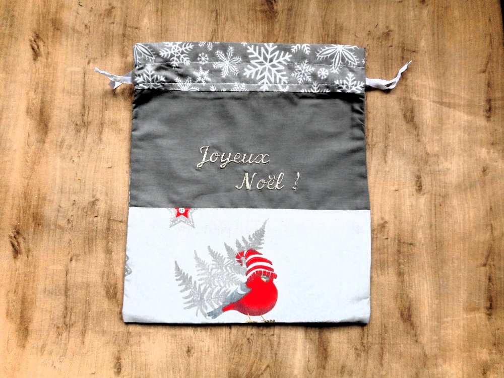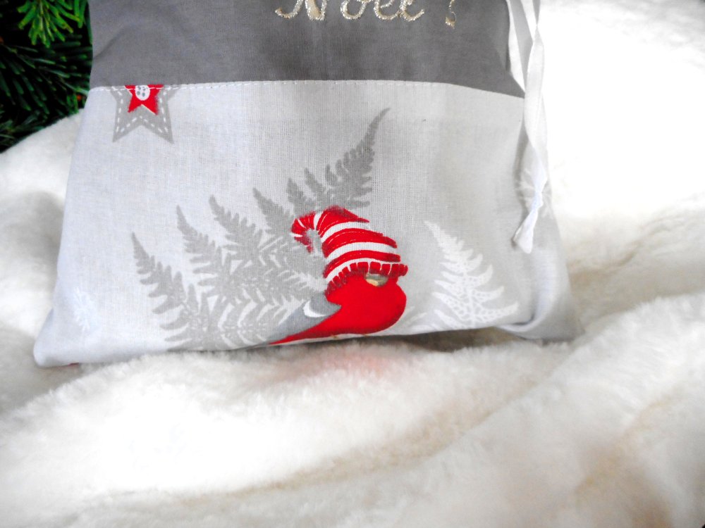 Sac cadeau en coton uni gris, la partie inférieure est imprimé d'un rouge gorge avec un bonnet de Noël sur fond gris clair, le dos est en coton gris imprimé de flocons de neige.