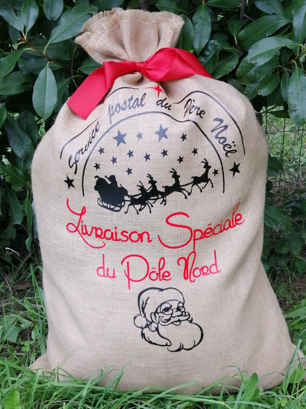 Sac Hotte du Père Noël en toile de jute – 100 % fait main et personnalisable. Apportez une touche de magie et d’authenticité à Noël
