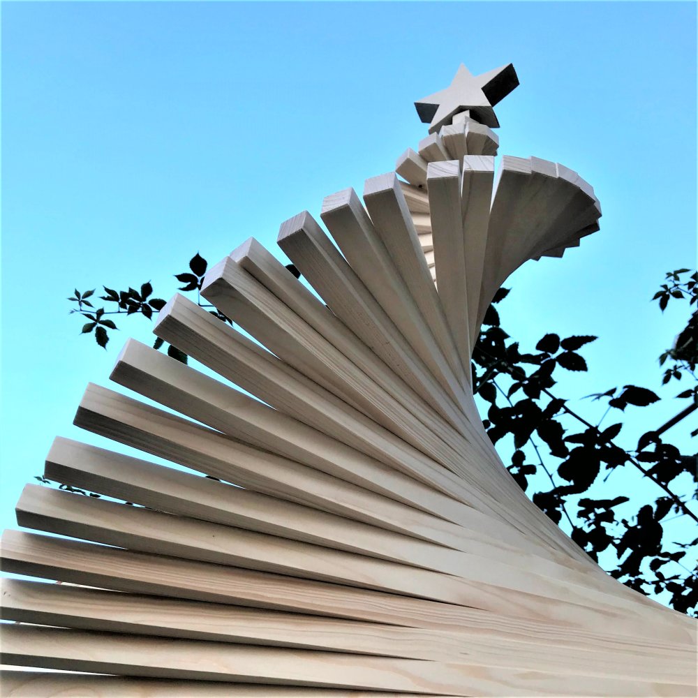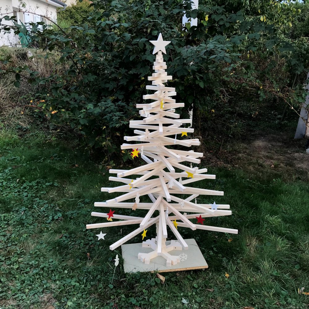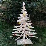 SAPIN De NOËL en bois naturel pied étoile. Hauteur, 1250 mm (49 7⁄32in). Largeur, 900 mm (35 7⁄16in). 45 Lattes orientables, tasseaux bois poncés, orientable à 360 degrés