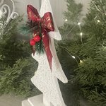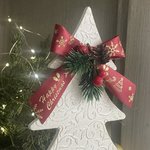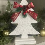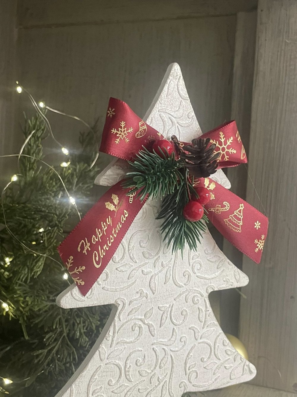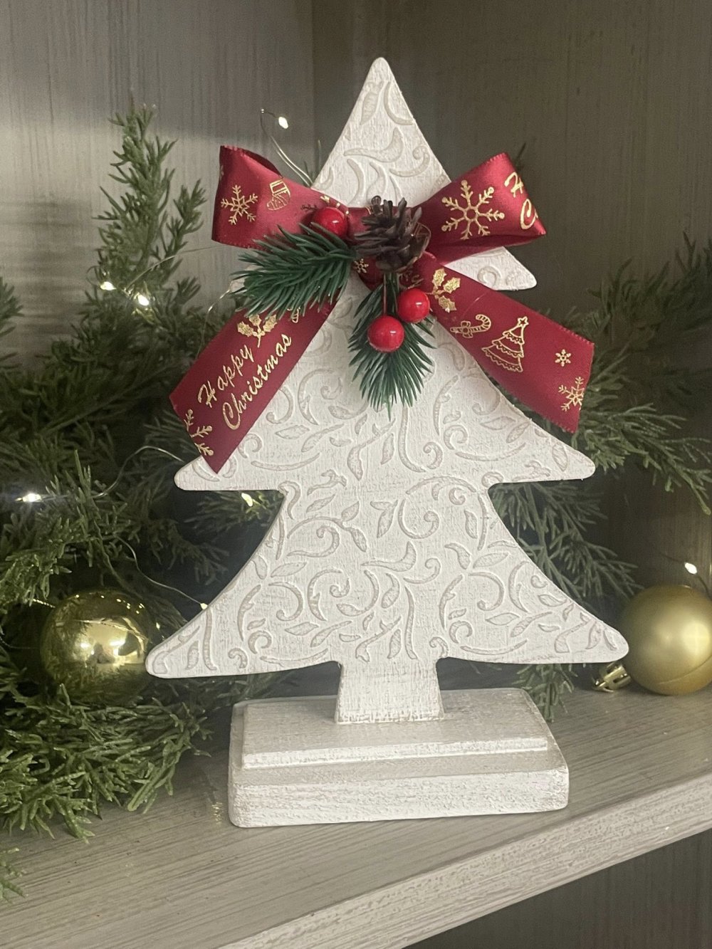 Je vous propose ce sapin en bois, décoré par mes soins d’arabesques en reliefs patinées en taupe et blanc, de verdure et d’un ruban.