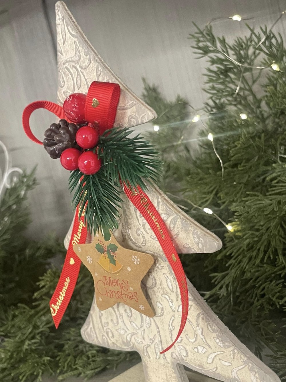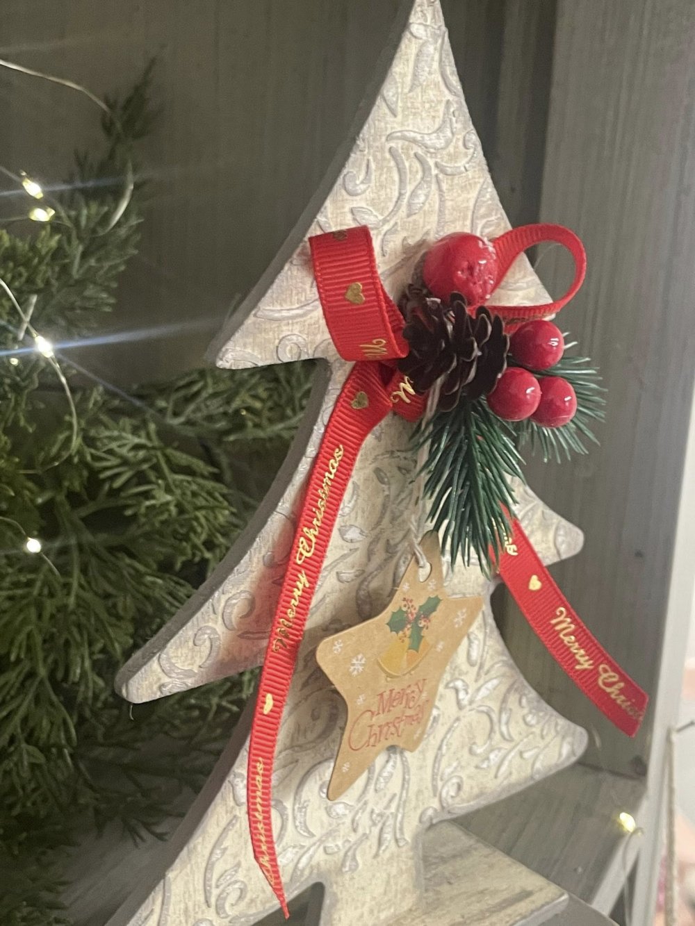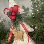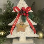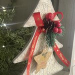 Je vous propose ce sapin en bois, décoré par mes soins d’arabesques en reliefs patinées en taupe et blanc, de verdure, d'une étiquette et d’un ruban.