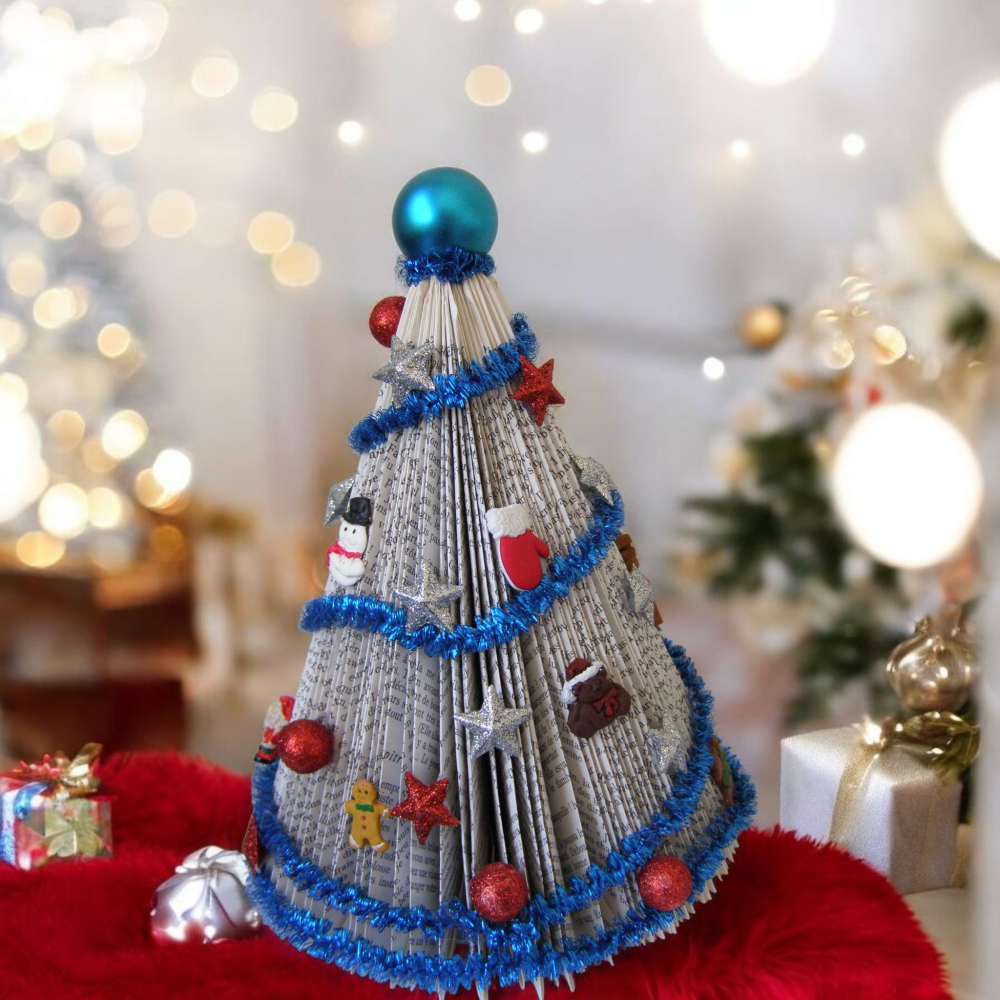 Égayer votre table de noël, avec ce livre plier en forme de sapin, et décoré dans mon atelier, avec une guirlande bleu, des petits décors de Noël en acrylique, et certains, réalisé en pâte polymère.