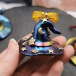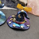 - Chapeau des sorcière bleu métallisé décoré de lune, d'étoile et de nuage dorés.