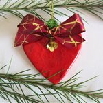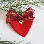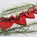 Décorations sapin de Noel, lot de 4 cœurs rouges, ruban et clochette