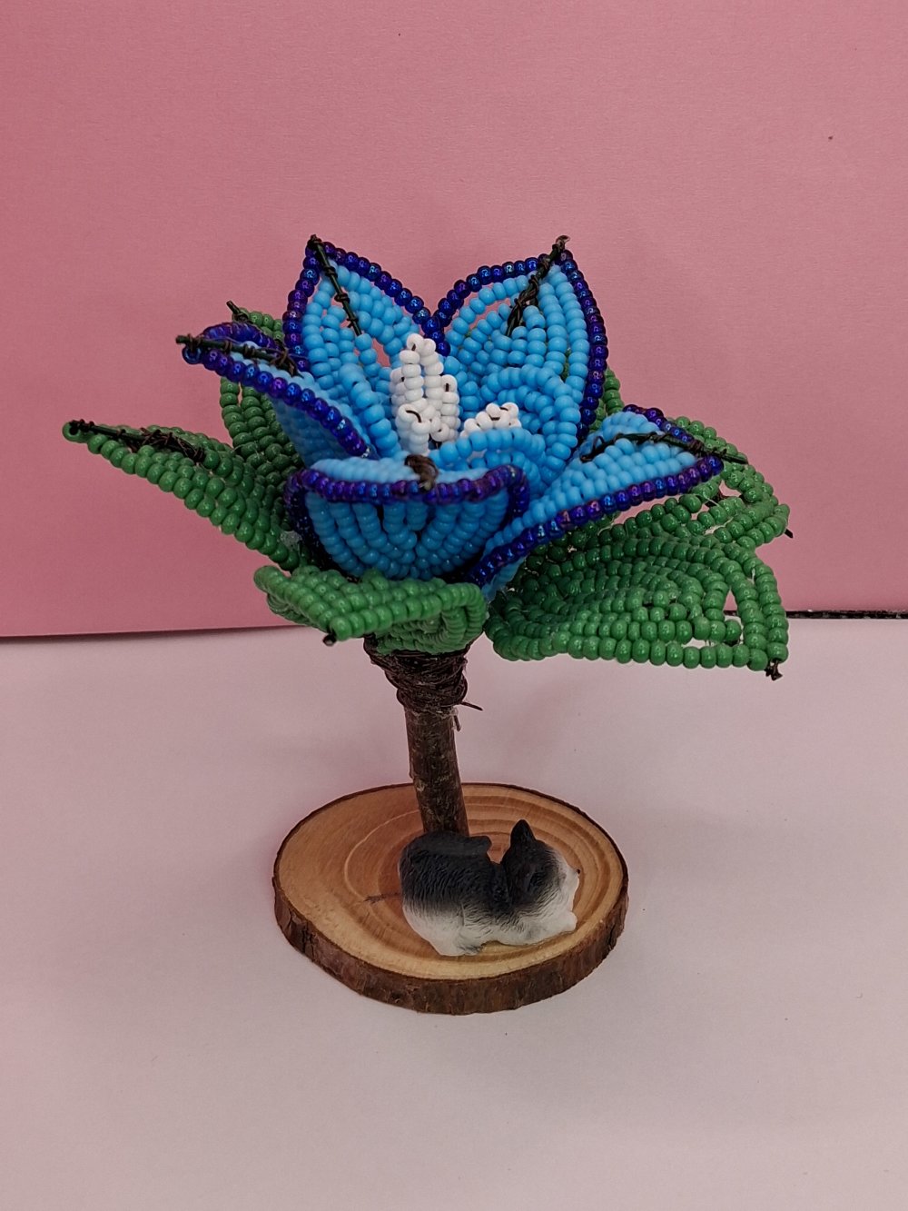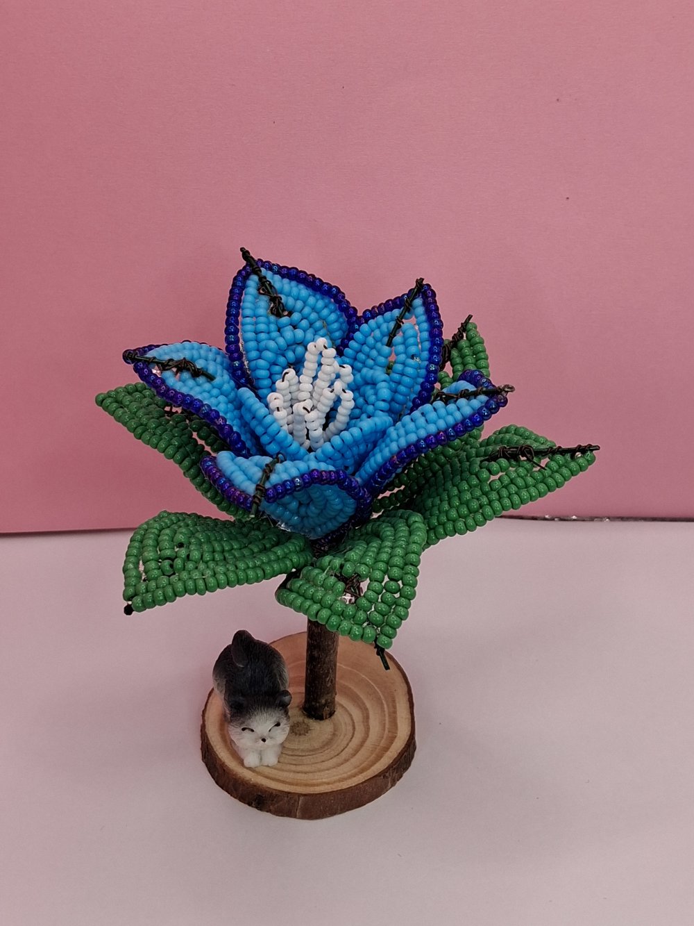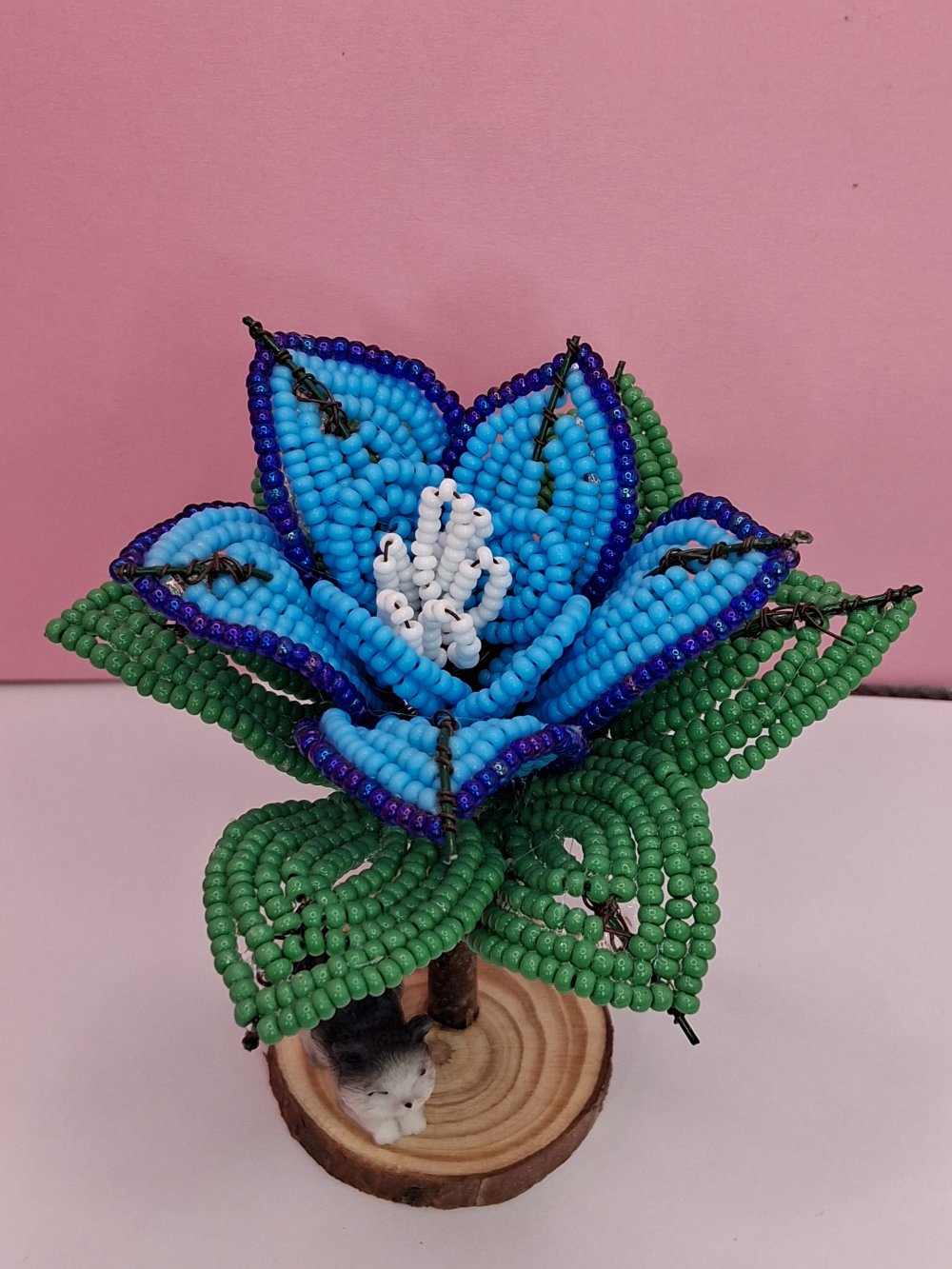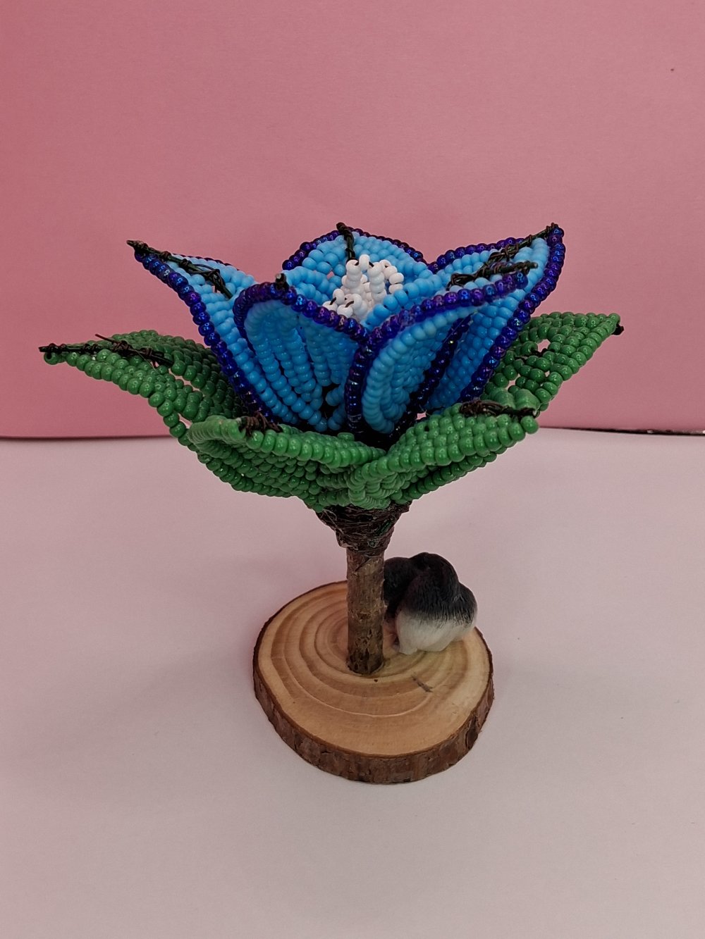 Découvrez cette magnifique fleur bleue et blanche, entièrement façonnée à la main avec des perles de rocaille.
