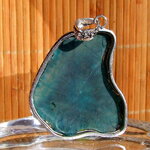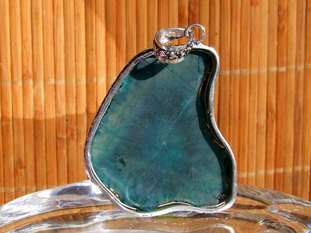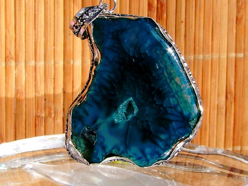 Pendentif artisanal réalisé à partir d'une tranche d'agate druzy de couleur bleu-vert foncé polie. L'agate est sertie sur une monture en cuivre plaqué argent. Grâce à un travail de martelage, la monture épouse parfaitement le pourtour de la pierre.
