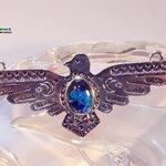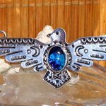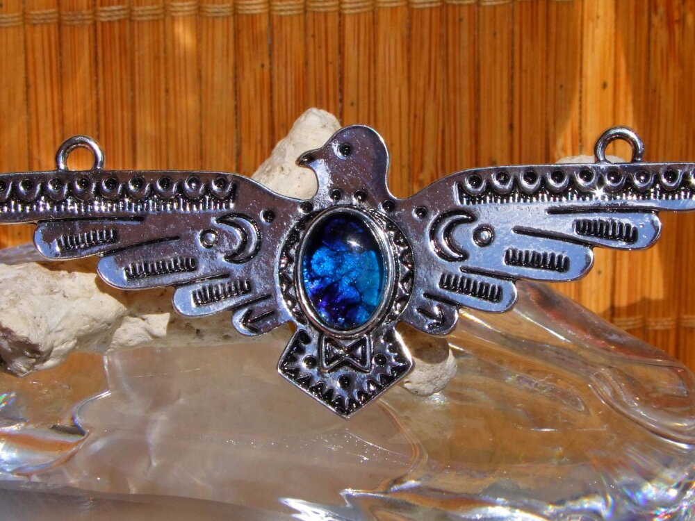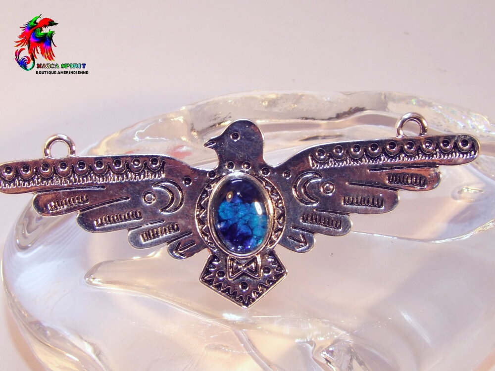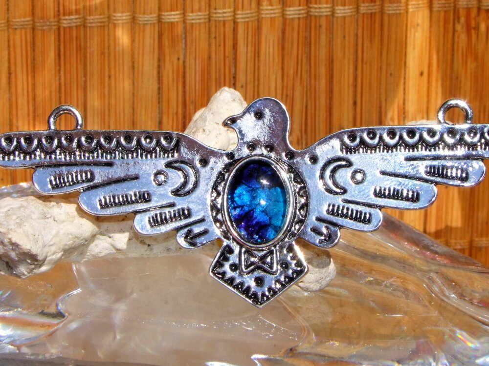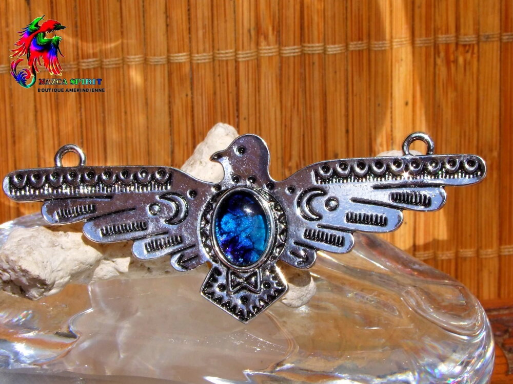 Grand Pendentif Amérindien de 9.1 cm / Totem Oiseau du Tonnerre Thunderbird /Métal Argenté /Gravures Symboles Ethniques /Cabochon Artisanale