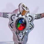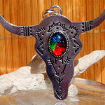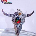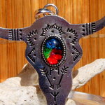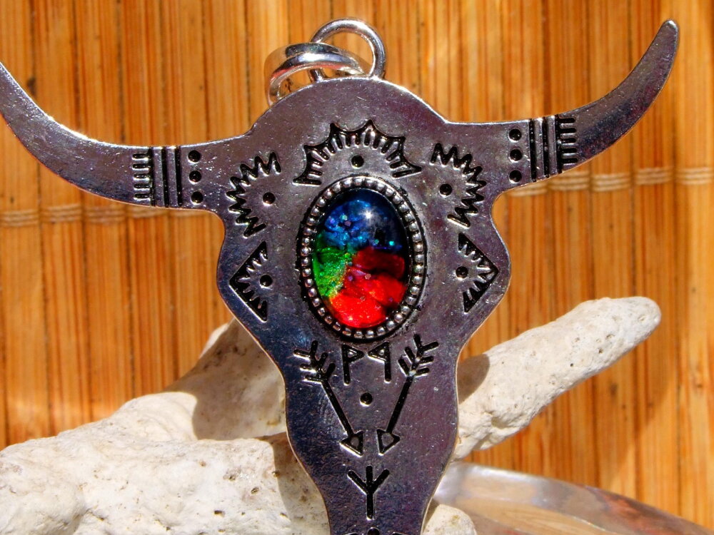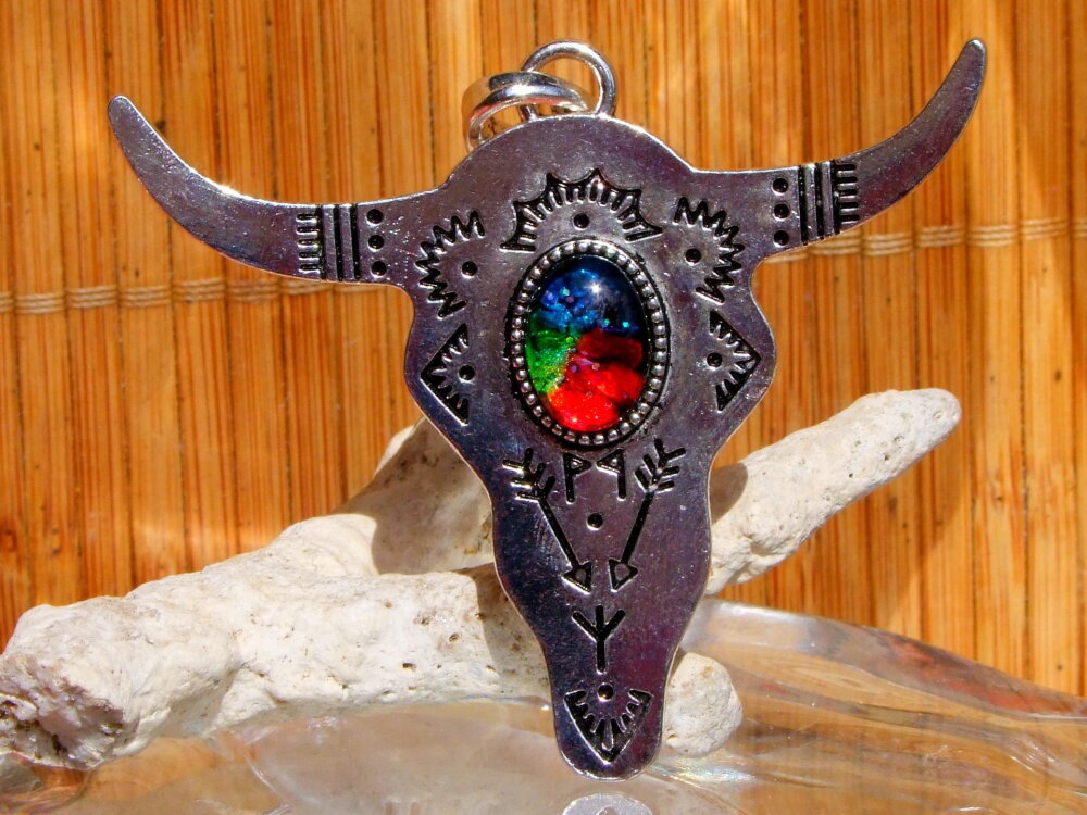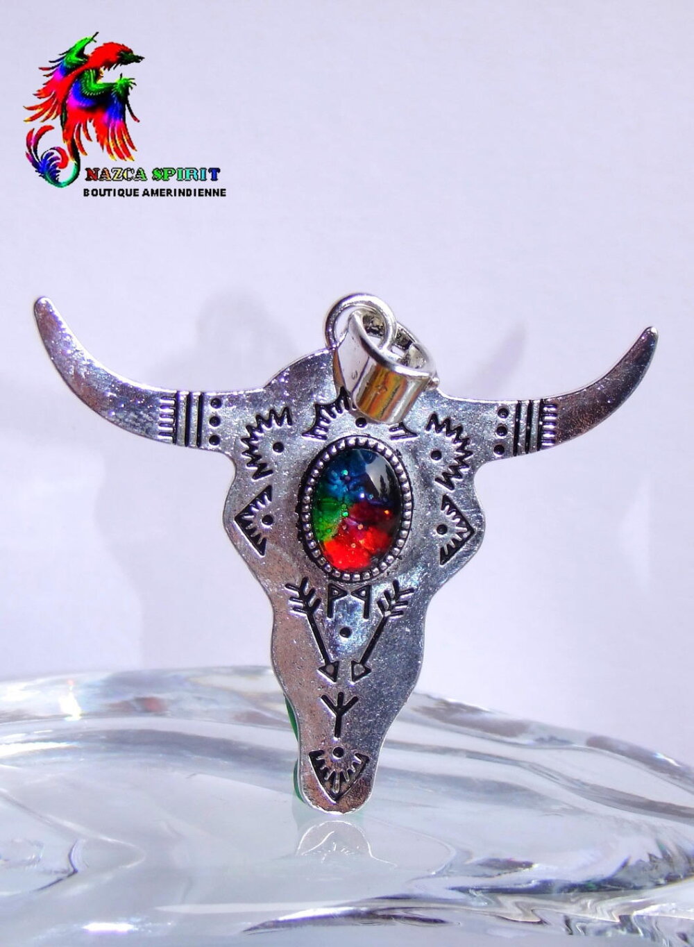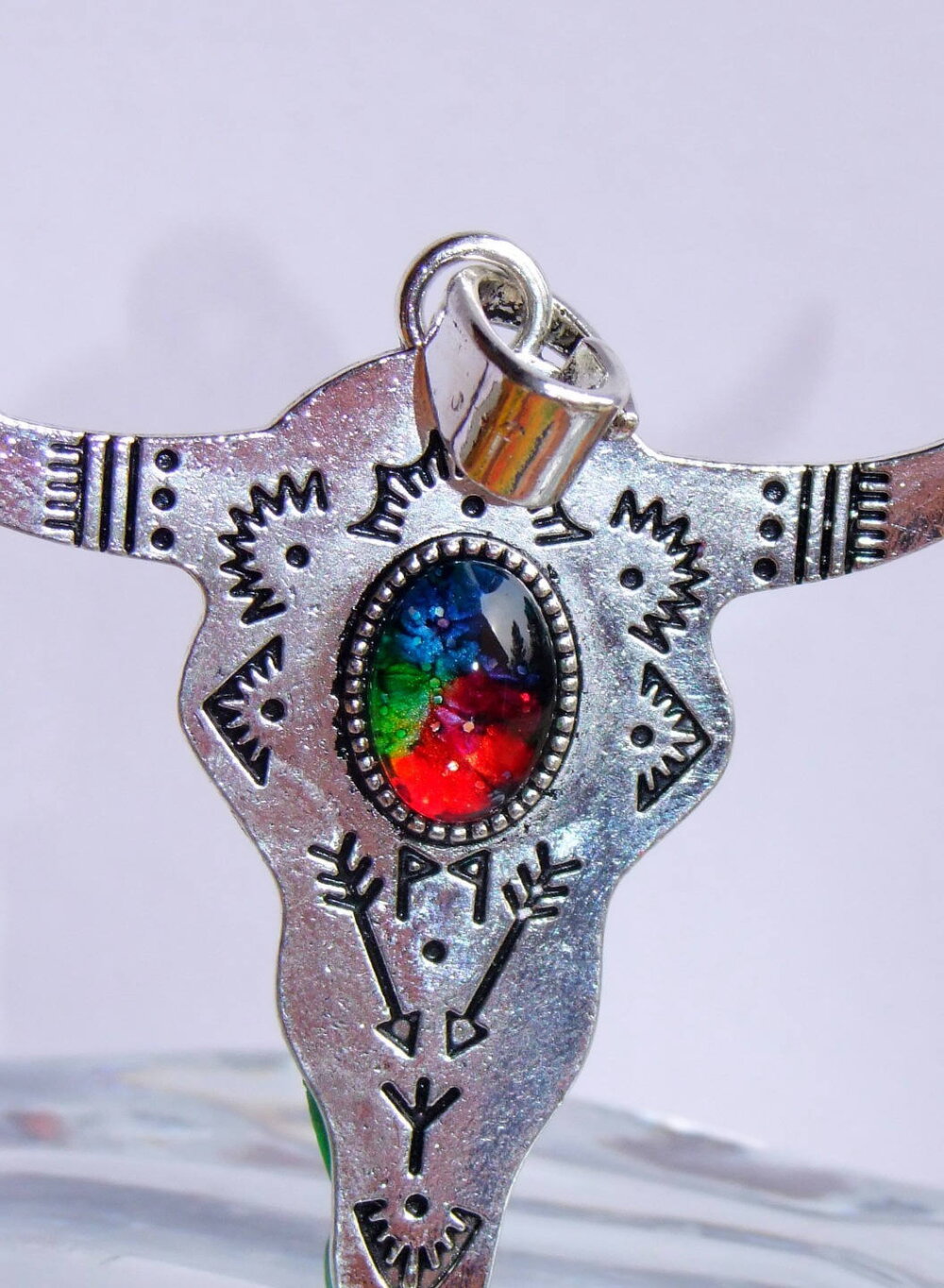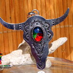 Grand Pendentif Tribal Ethnique de 7.1 cm - Tête de Boeuf Bison - Métal Argenté - Gravures Symboles Ethniques,Cabochon Coloration Artisanale