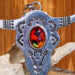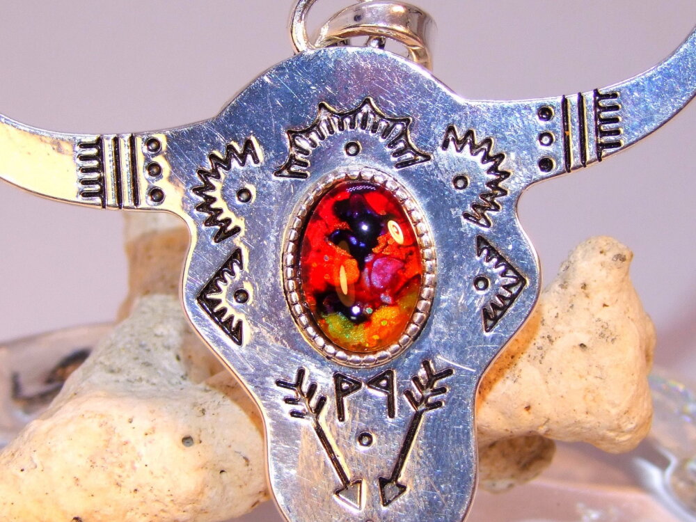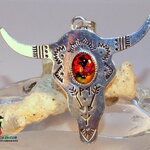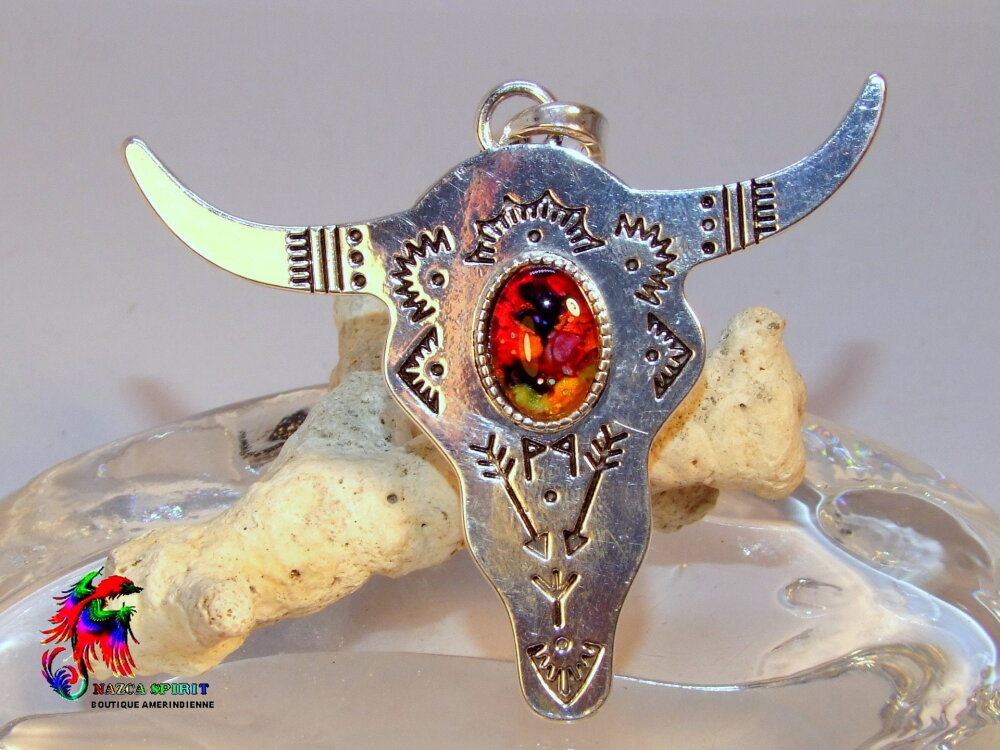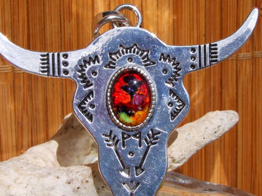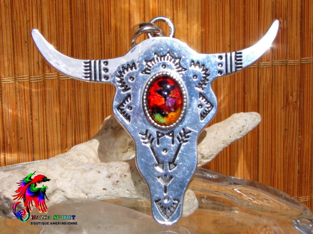 Grand Pendentif Tribal Ethnique de 7.1 cm, Tête de Boeuf Bison Métal Argenté, Gravures Symboles Ethniques, Cabochon Coloration Artisanale