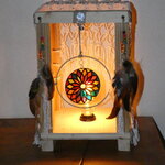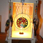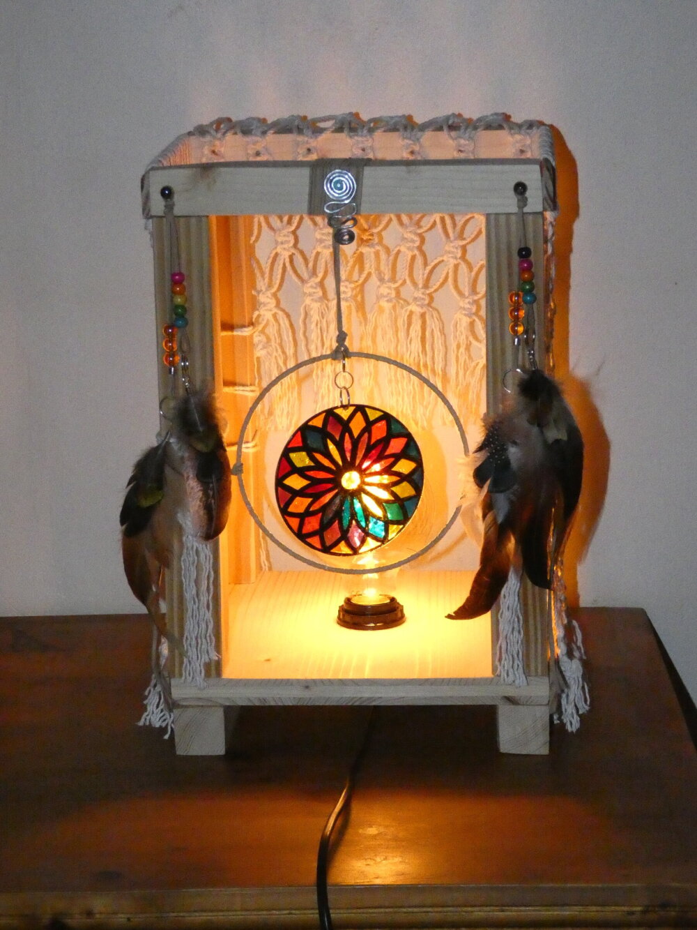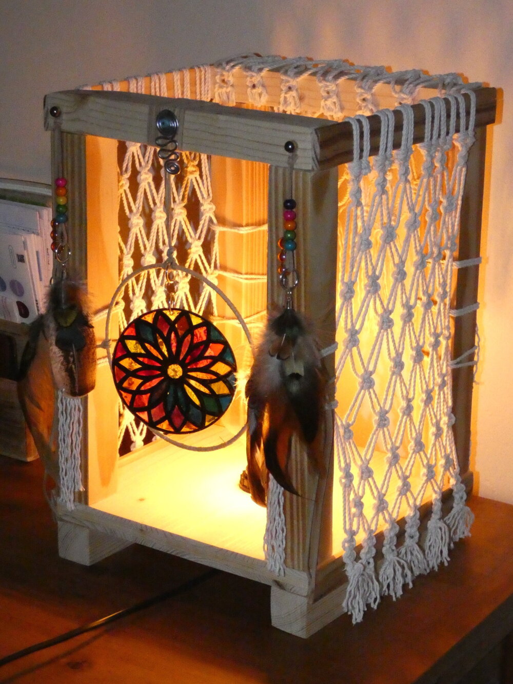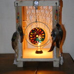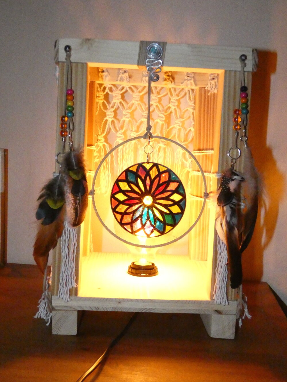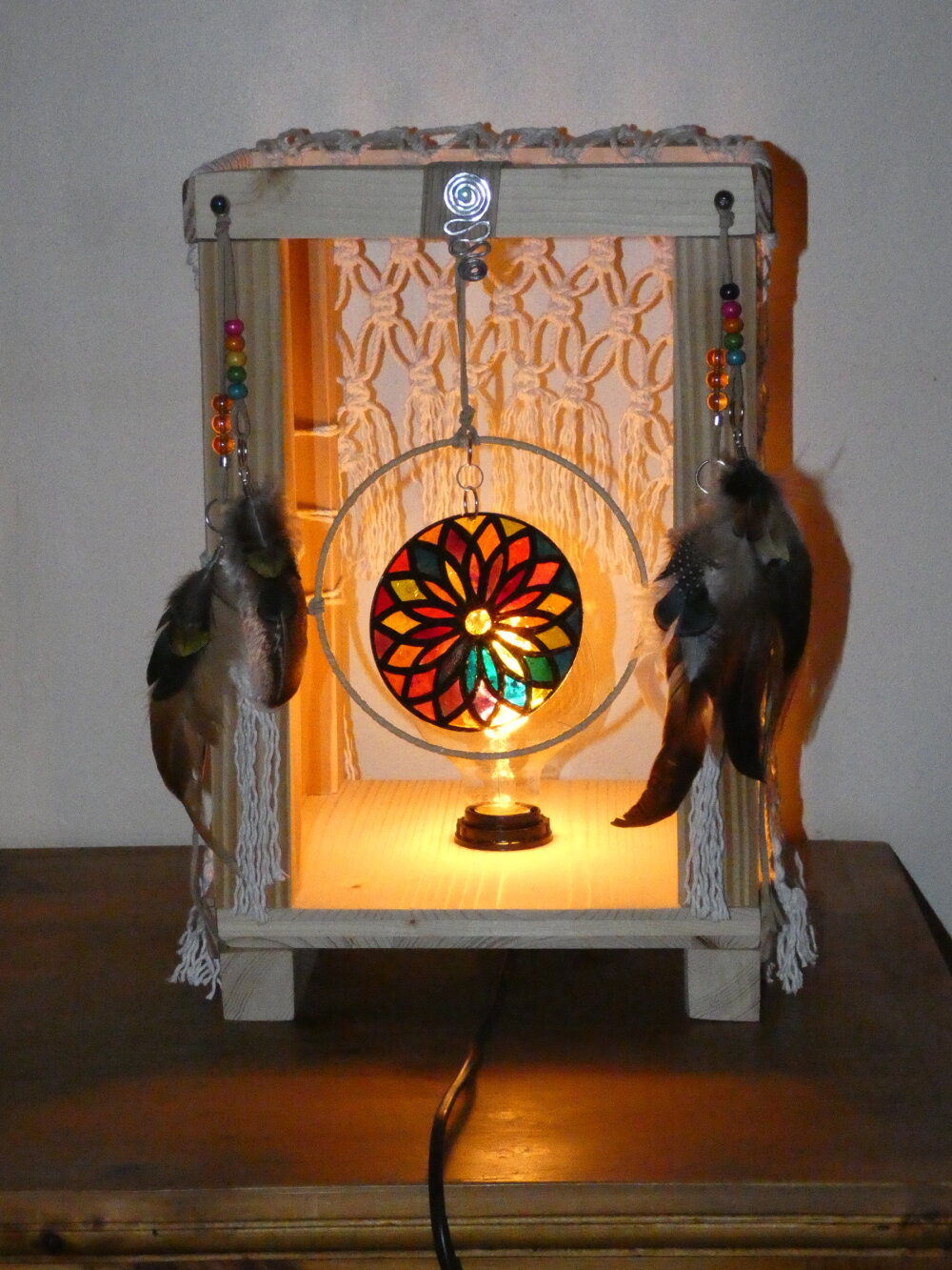 Une lampe entièrement réalisée à la main à partir de bois de palette recyclé. Ce bois a été coupé, poncé et vernis. J'ai ajouté des filets en macramé réalisés par moi-même, ainsi que des pampilles : perles en verre, plumes naturelles, et un disque en plexiglas représentant une rosace que j'ai réalisée à l'aide de la technique du vitrail. Le vitrail a été ensuite enduit d'une résine cristal de finition afin de bloquer les couleurs. Pour apporter une touche amérindienne, j'ai relié le disque de plexiglas au centre d'un cercle représentant un attrape-rêves.
