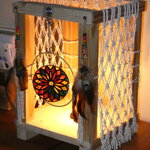J'ai réalisé cette lampe très originale à partir de bois recyclé, de corde en coton pour concevoir mon filet en macramé, et d'un disque en plexiglas sur lequel j'ai peint à la main une rosace en utilisant la technique du vitrail. Les montants de la lampe ont été agrémentés de longs pendentifs réalisés à partir de plumes naturelles et de perles en bois et en verre.