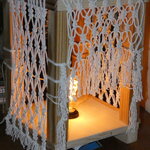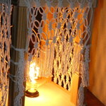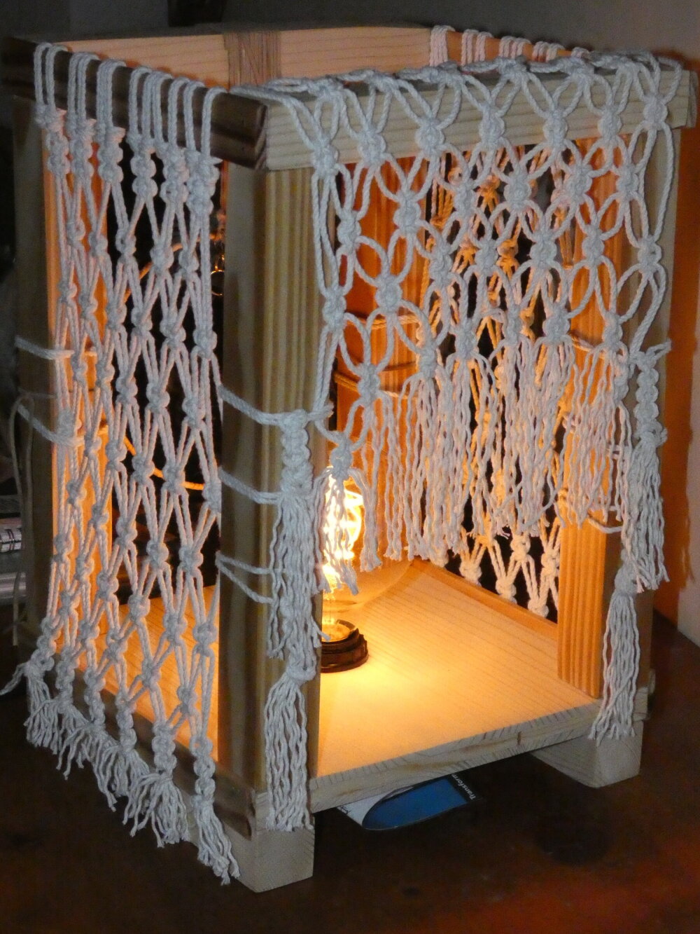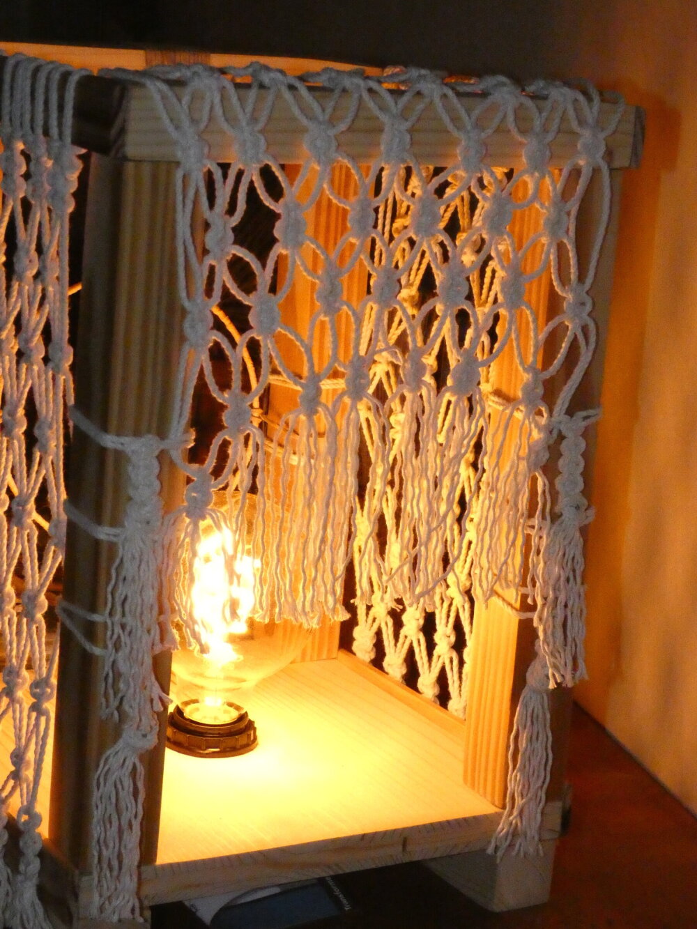 L'objectif étant de créer à la fois un jeu d'ombres (grâce aux filets en macramé) et de lumière colorées lorsque la lampe est allumée.