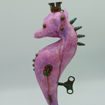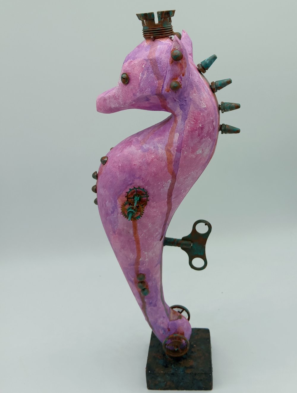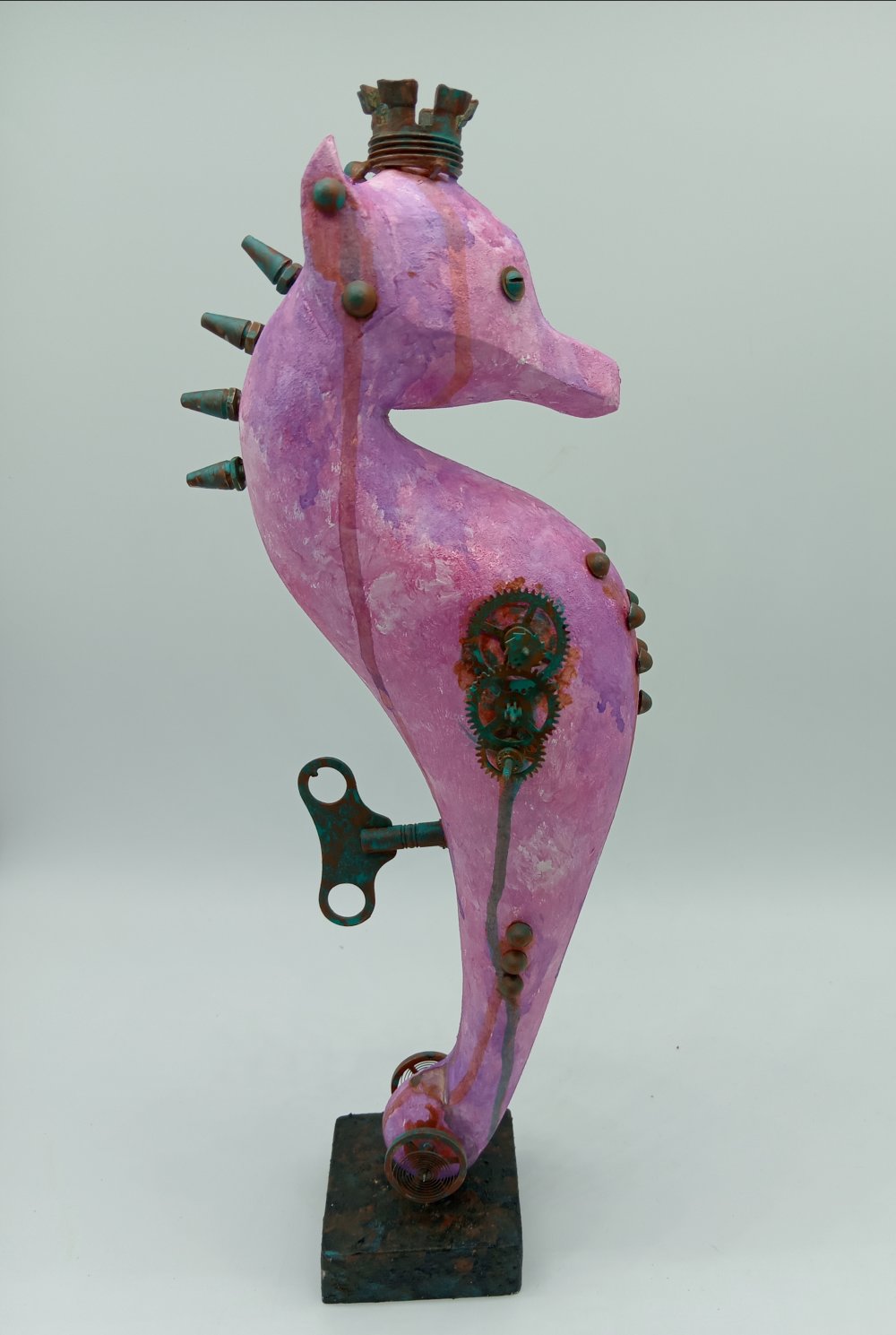 Sculpture d'un hippocampe steampunk sculpté dans du bois de tilleul.